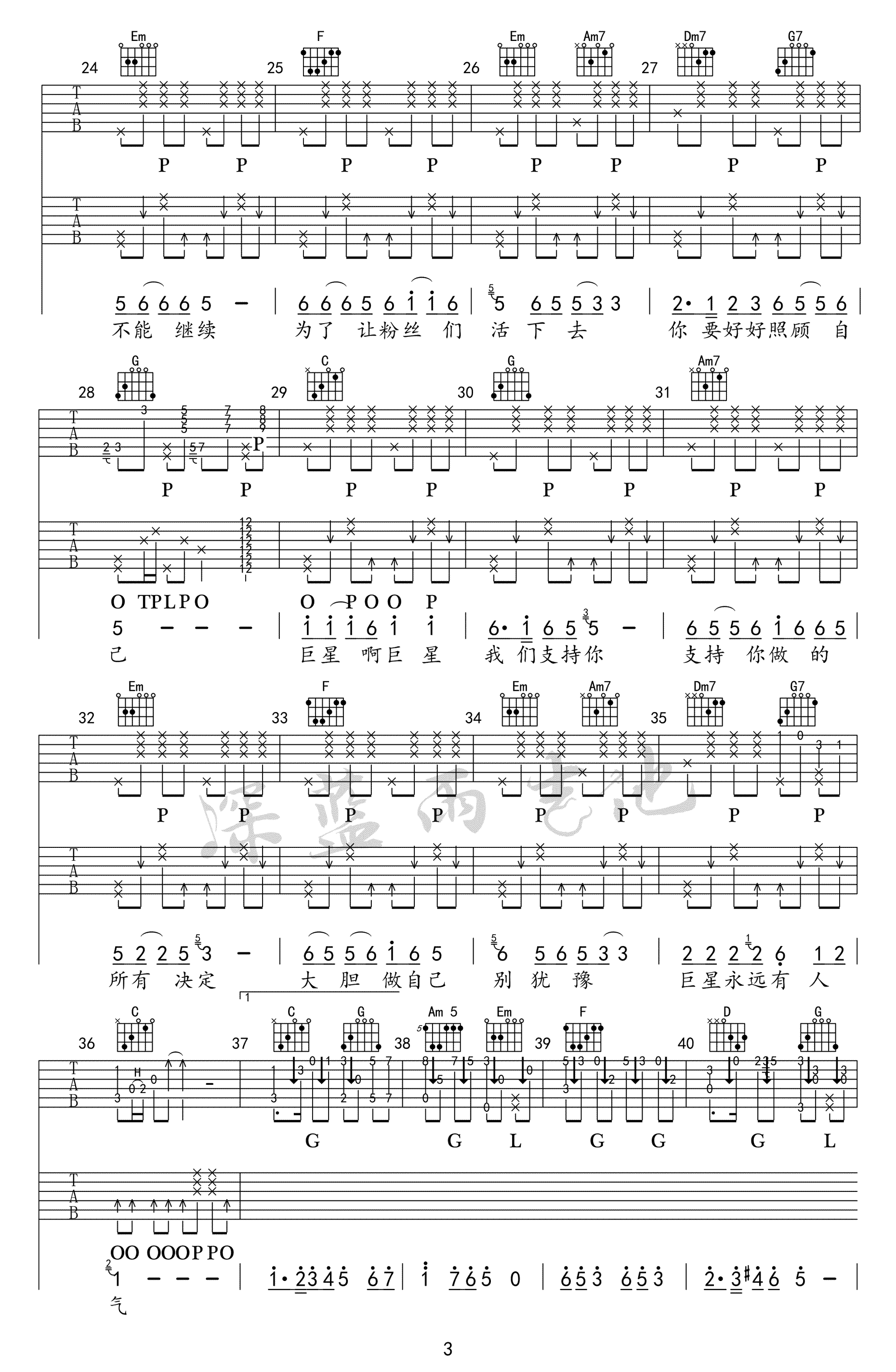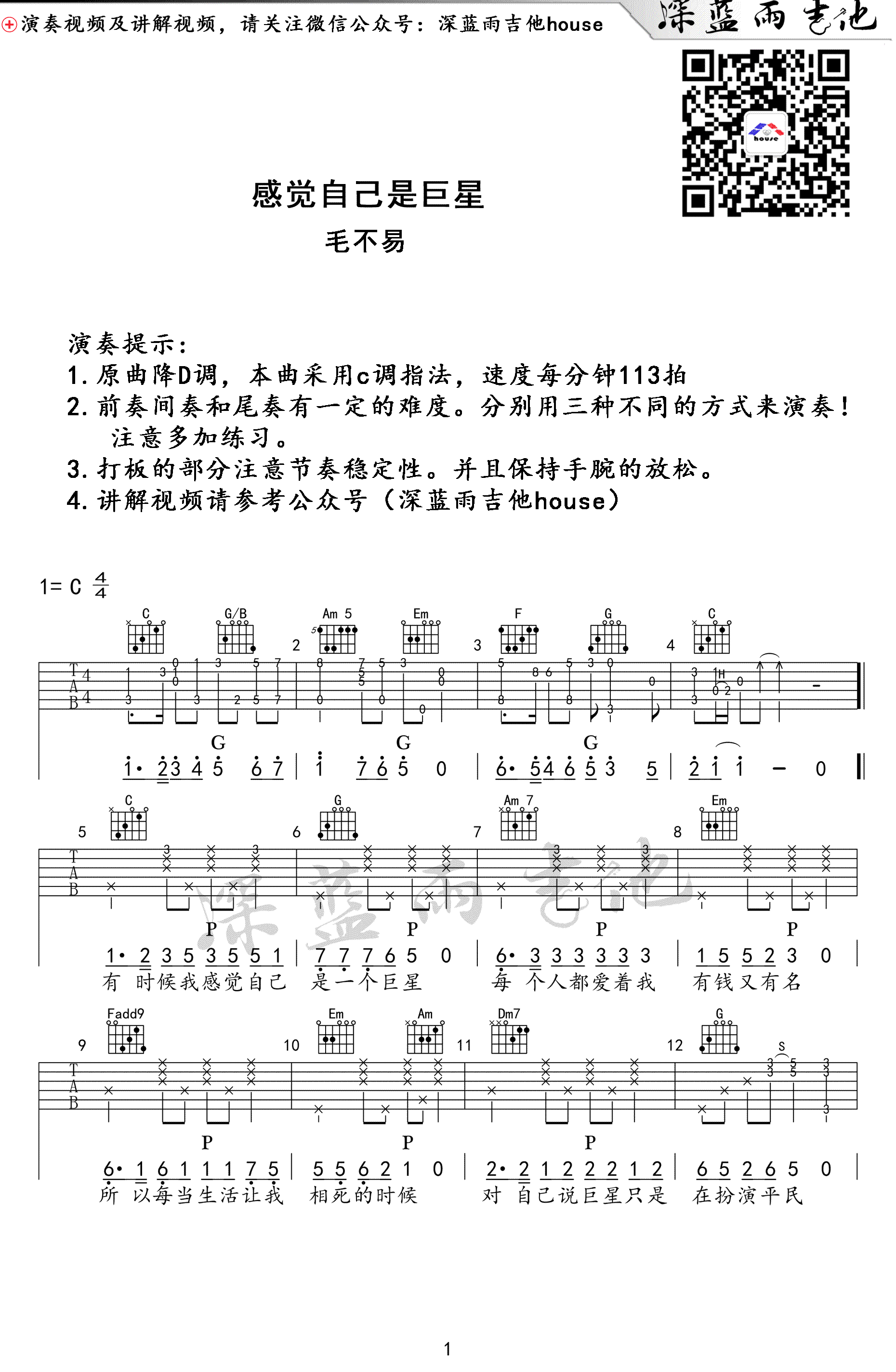 曲谱介绍: 毛不易《感觉自己是巨星》吉他谱,六线谱高清版,四张图片谱例,感觉自己是巨星吉他弹唱谱,演奏提示,原曲降D调,本曲采用c调指法,速度每分钟113拍。前奏间奏和尾奏有一定的难度,分别用三种不同的方式来演奏,注意多加练习。打板的部分,注意节奏稳定性,并且保持手腕的放松。随谱附上深蓝雨吉他教学视频,91吉他谱网站整理上传分享。 吉他弹唱演示: 吉他弹唱讲解教学: