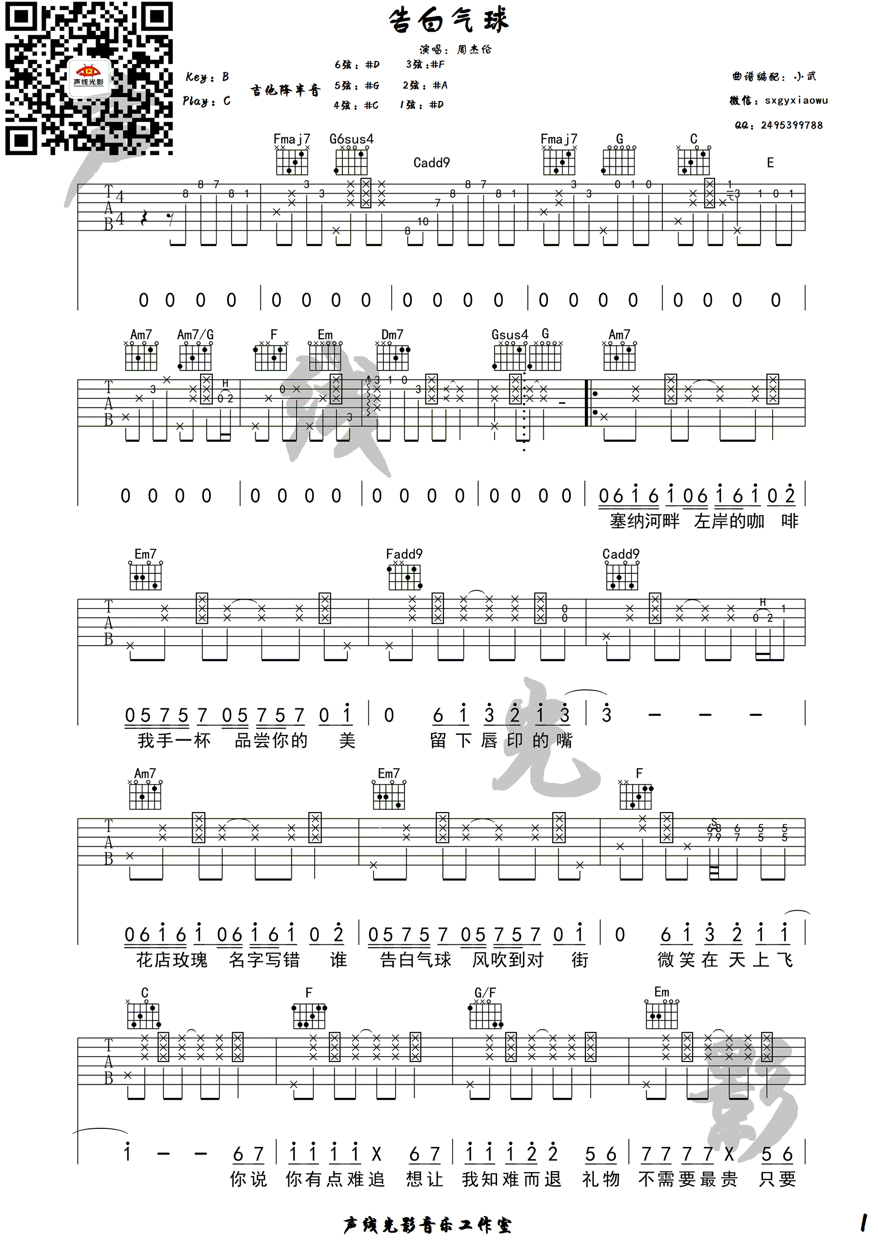 曲谱介绍: 告白气球吉他谱,原调B,选调C,吉他降半音调弦。周杰伦的《告白气球》吉他弹唱谱,三张高清图片谱例。感谢声线光影出品,随谱附上小武老师带给大家《告白气球》吉他弹唱教学视频。