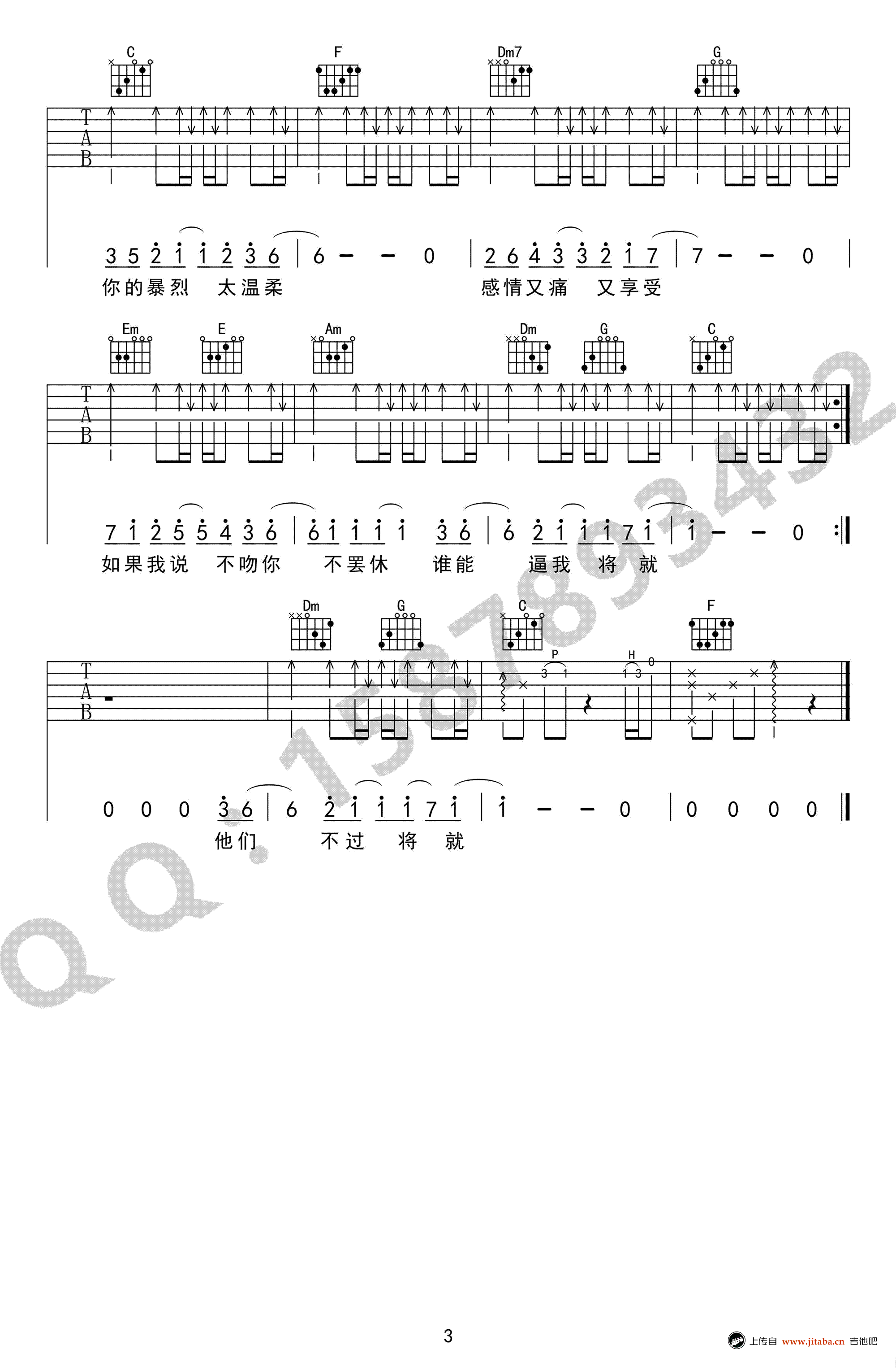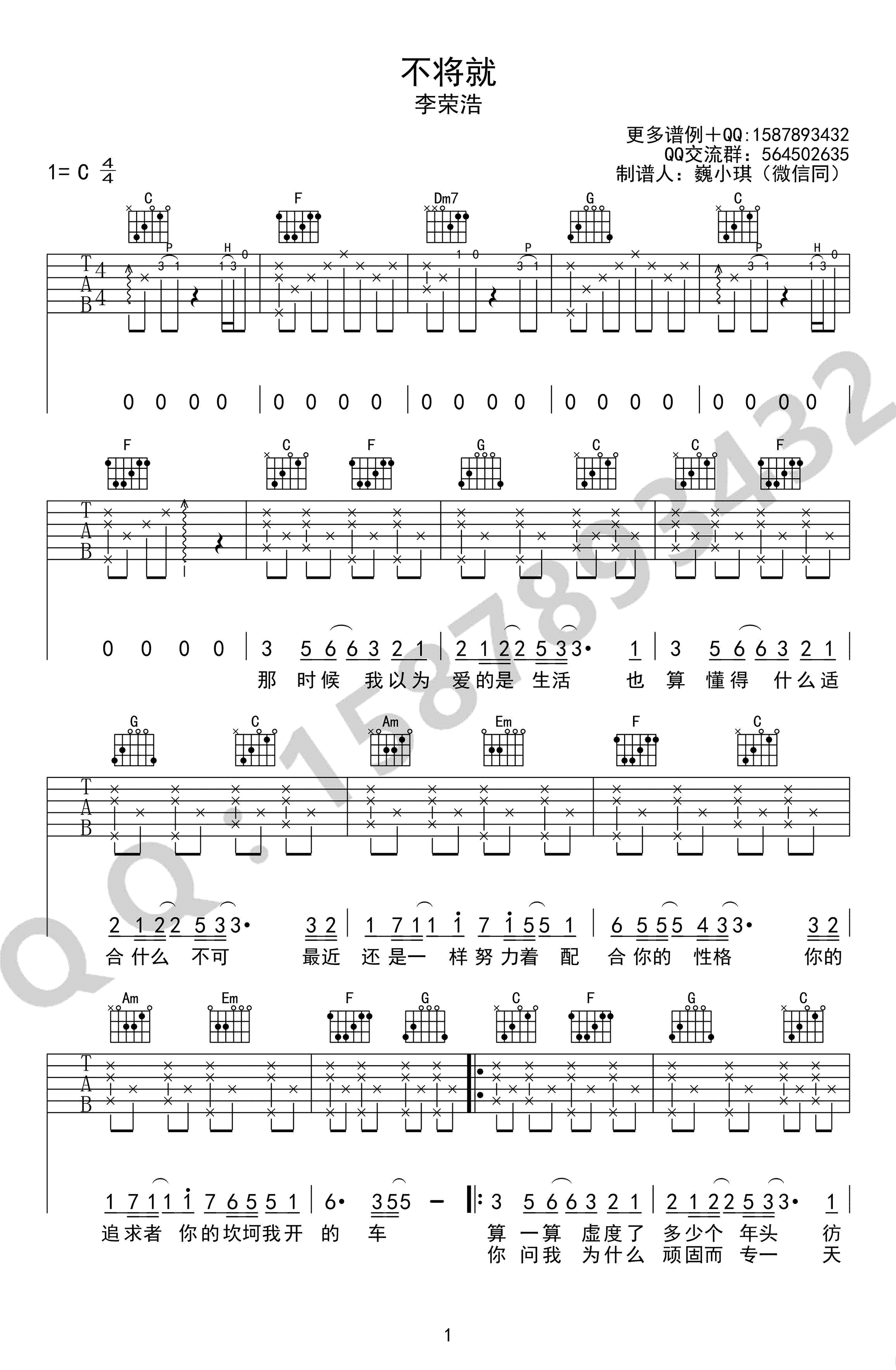曲谱介绍: 李荣浩《不将就》吉他谱,C调指法编配,高清六线谱,三张图片谱。不将就吉他弹唱谱,前奏很好听,巍小琪制谱,91吉他谱网站分享。 这首歌曲是电影版《何以笙箫默》片尾曲,黄伟文作词,李荣浩作曲。细腻的情感,坚定不移唱出现实对梦想的执着,磁性嗓音娓娓道出不将就的爱情宣言。