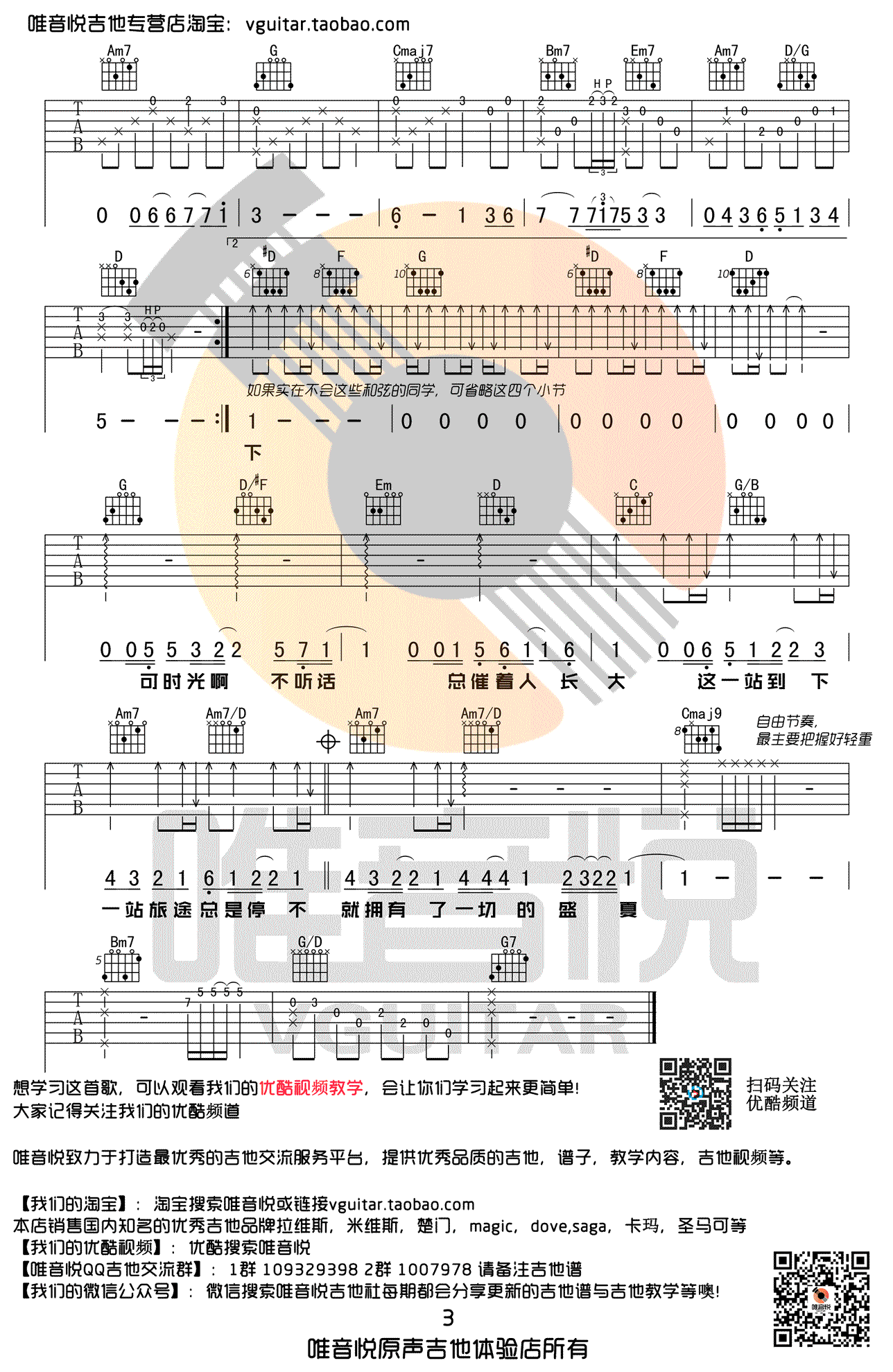 曲谱介绍: 毛不易演唱,G调指法编配,原版吉他谱,前奏编配较难,盛夏六线谱,三张高清图片谱。明日之子节目冠军毛不易的一首值得推荐的好听原创歌曲,唯音悦出品,91吉他谱网站上传分享。 一首关于青春的歌曲,没有华丽的词藻和炫酷的唱腔,温暖低沉嗓音演绎着往日深情,歌声中。往事流逝,忧伤回忆萦绕心头。