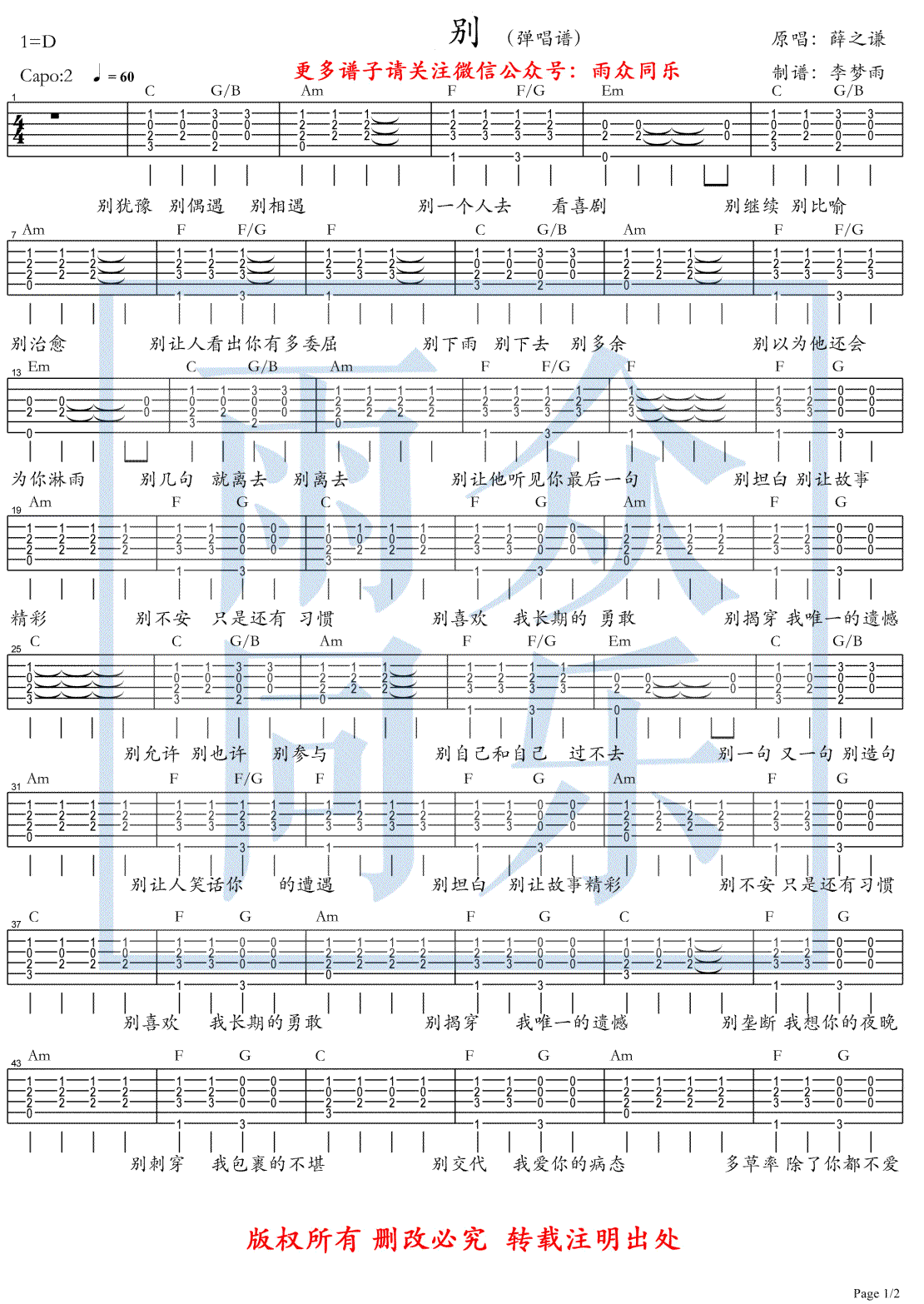 曲谱介绍: 薛之谦《别》吉他谱,Capo夹二品,别吉他弹唱谱,两张图片谱例。老薛终于发新歌了!一首《别》听得人心口酸酸的。这首歌旋律很简单,但是在老薛深情的吟唱下,配合“别”字开头的歌词,唱出了他人生的经历和感悟,也唱出了我们心底的各种情绪,非常有感染力。感谢雨众同乐编配出品,91吉他谱曲谱上传。 这首《别》,老薛包揽词曲,歌词格式类似三行情诗,“别犹豫,别偶遇,别相遇”每一整句前后末尾都是相同的韵母,十分上口。尤其,歌曲没有前奏,第一句像被人捂住嘴巴那样艰难唱出,越到后面情绪越高涨,仿佛挣脱~