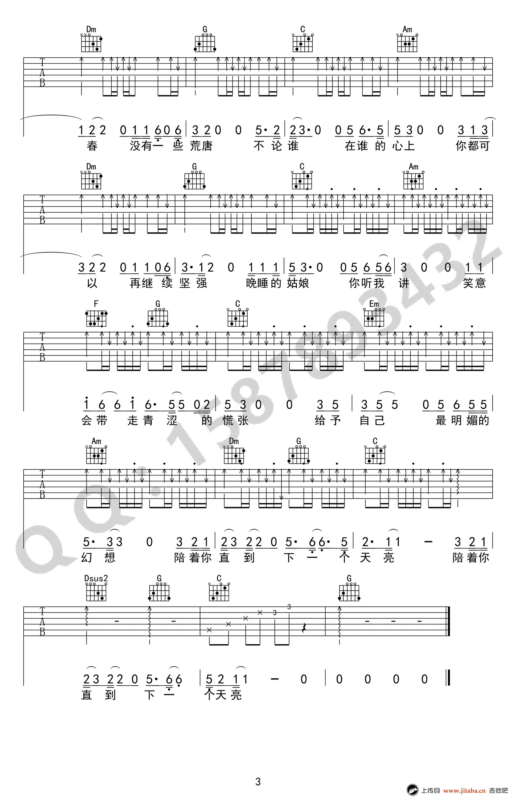 曲谱介绍: 周新诚《晚睡的姑娘》吉他谱,变调夹夹三品,C调指法编配,一首民谣歌曲,晚睡的姑娘六线谱,吉他弹唱谱,三张图片谱例,巍小琪编配制作,91吉他谱推荐上传。