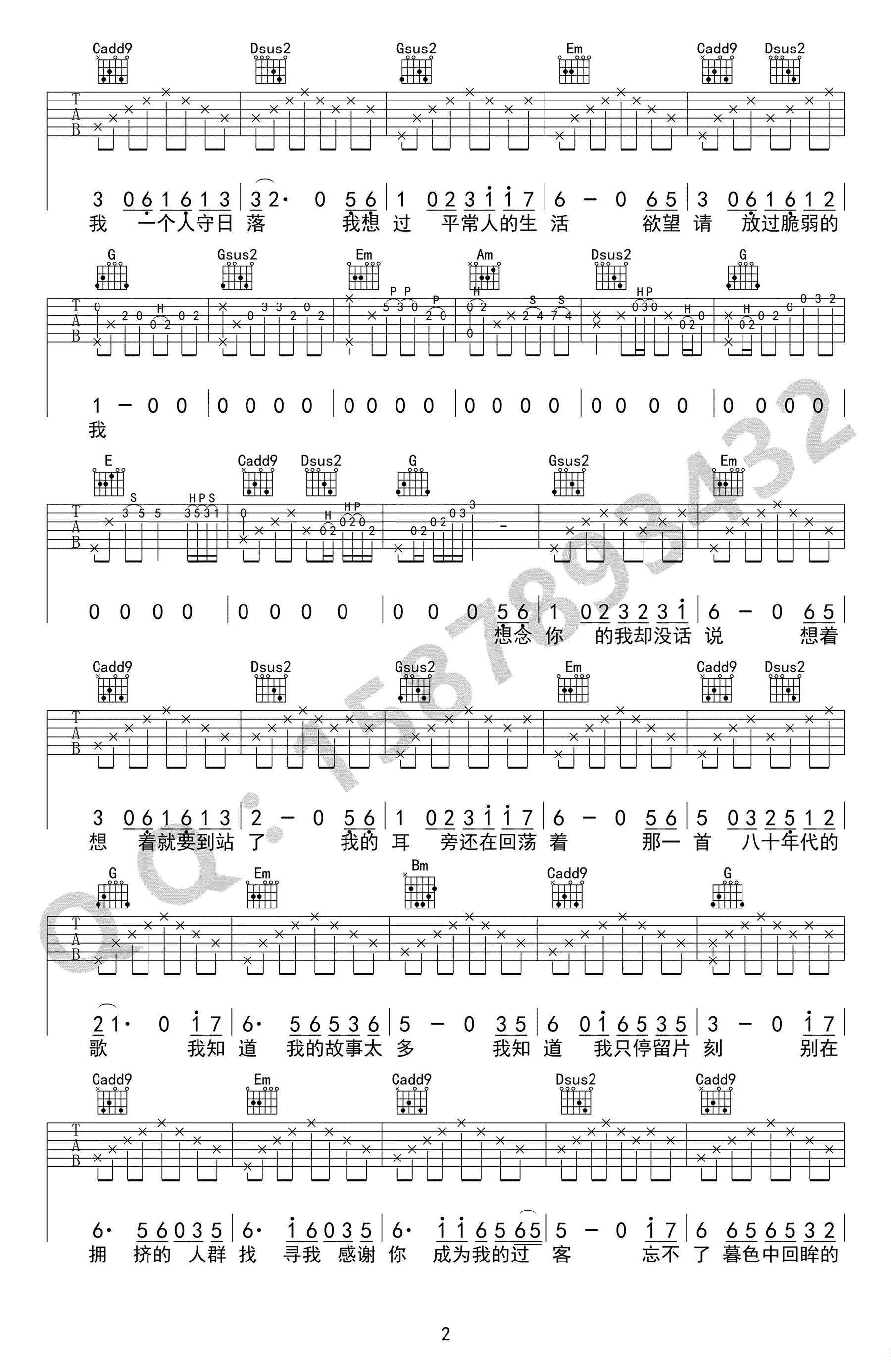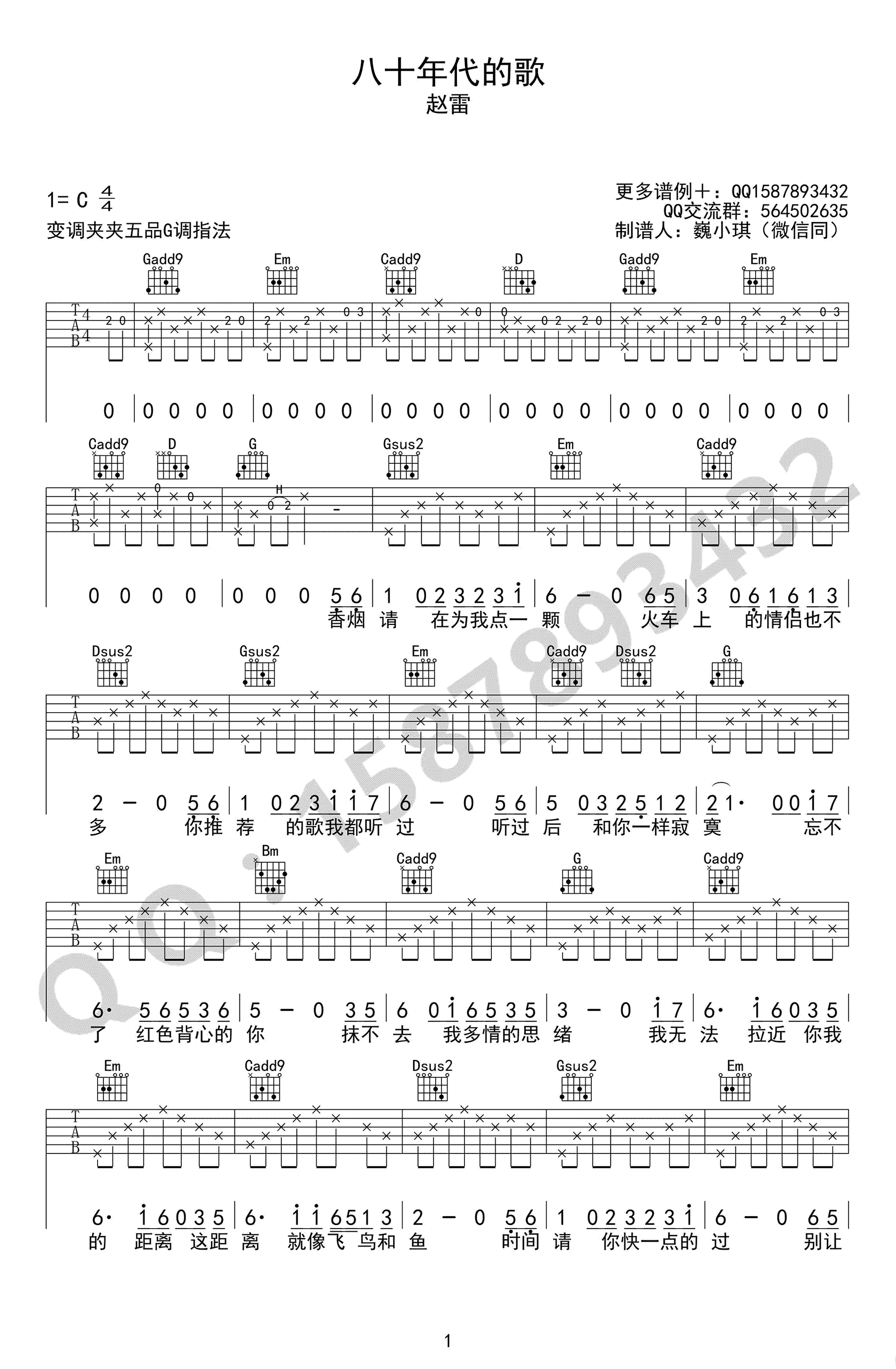 曲谱介绍: 赵雷《八十年代的歌》吉他谱,G调高清弹唱谱,CAPO夹五品,80年代的歌六线谱,带好听的前奏,三张图片谱高清版。本曲谱由巍小琪编配制谱,91吉他谱网站上传。 一首停留在真爱粉的歌单里的民谣,叙事的歌词,简单的情节,火车一路驰骋,听着那些年她推荐的歌,心中对爱人的思念从没有停止。
