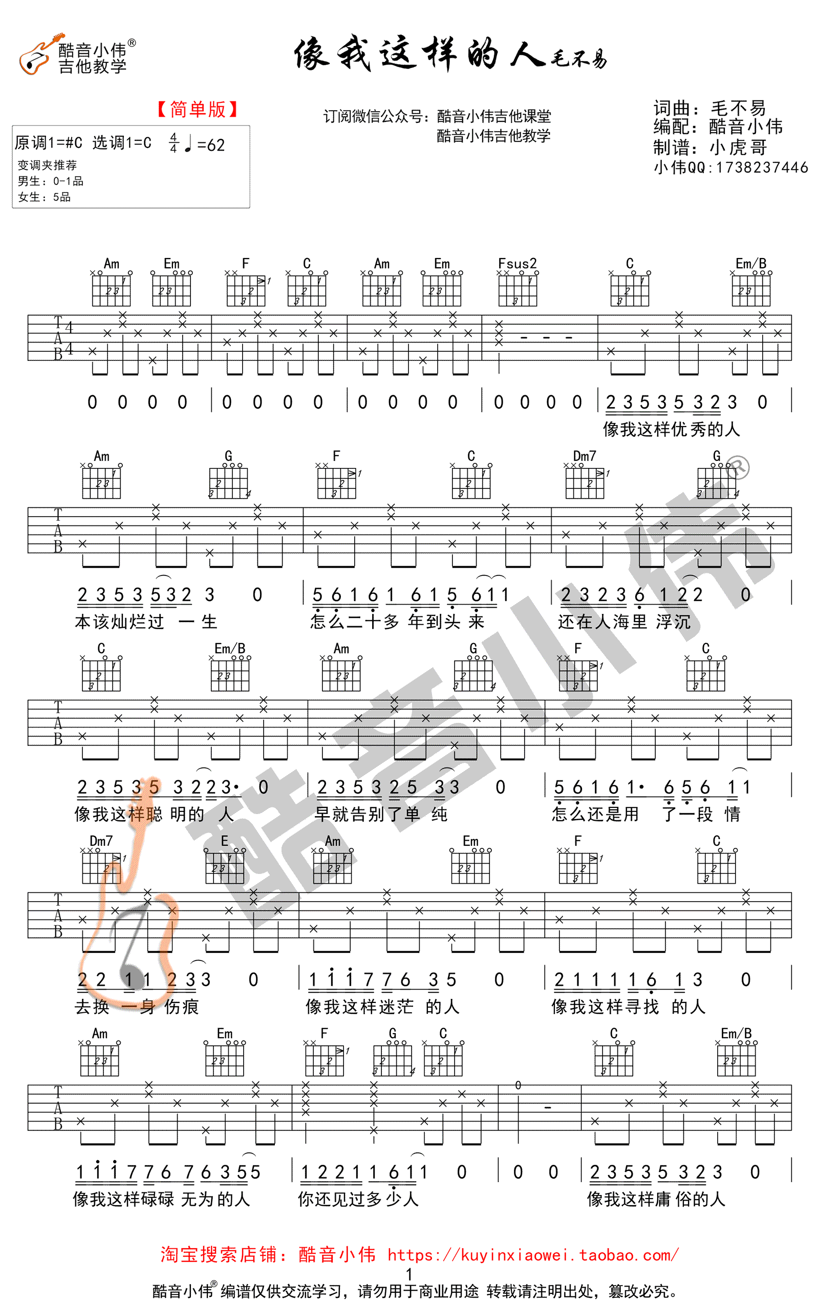 曲谱介绍: 像我这样的人吉他谱,毛不易的一首热门歌曲,本曲谱为C调简单版编配,适合入门级的琴友弹唱练习。像我这样的人六线谱,高清弹唱他图片谱,歌曲原调升C,变调夹推荐男生0-1品,女生5品。感谢酷音小伟出品,91吉他谱为琴友们推荐分享。