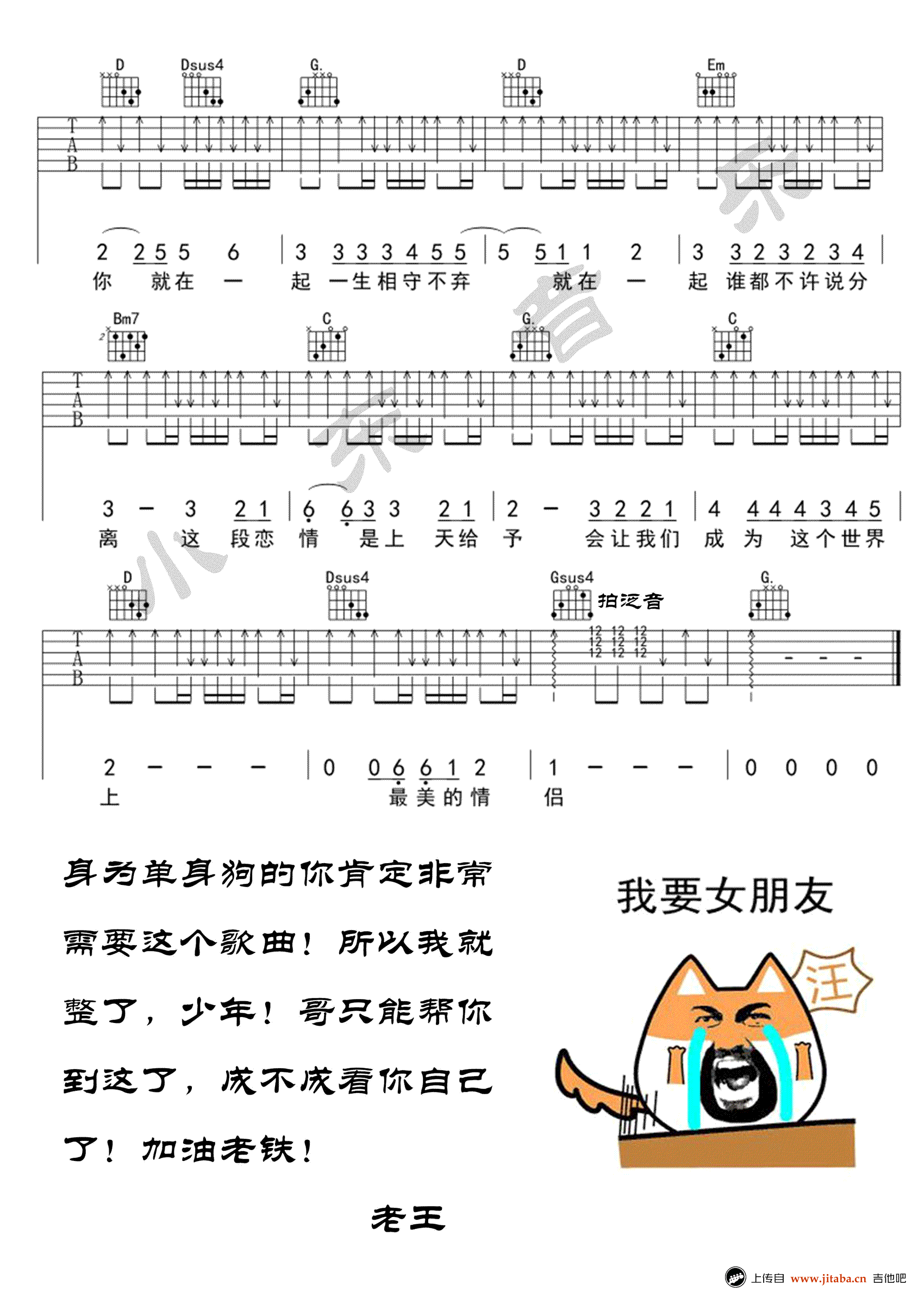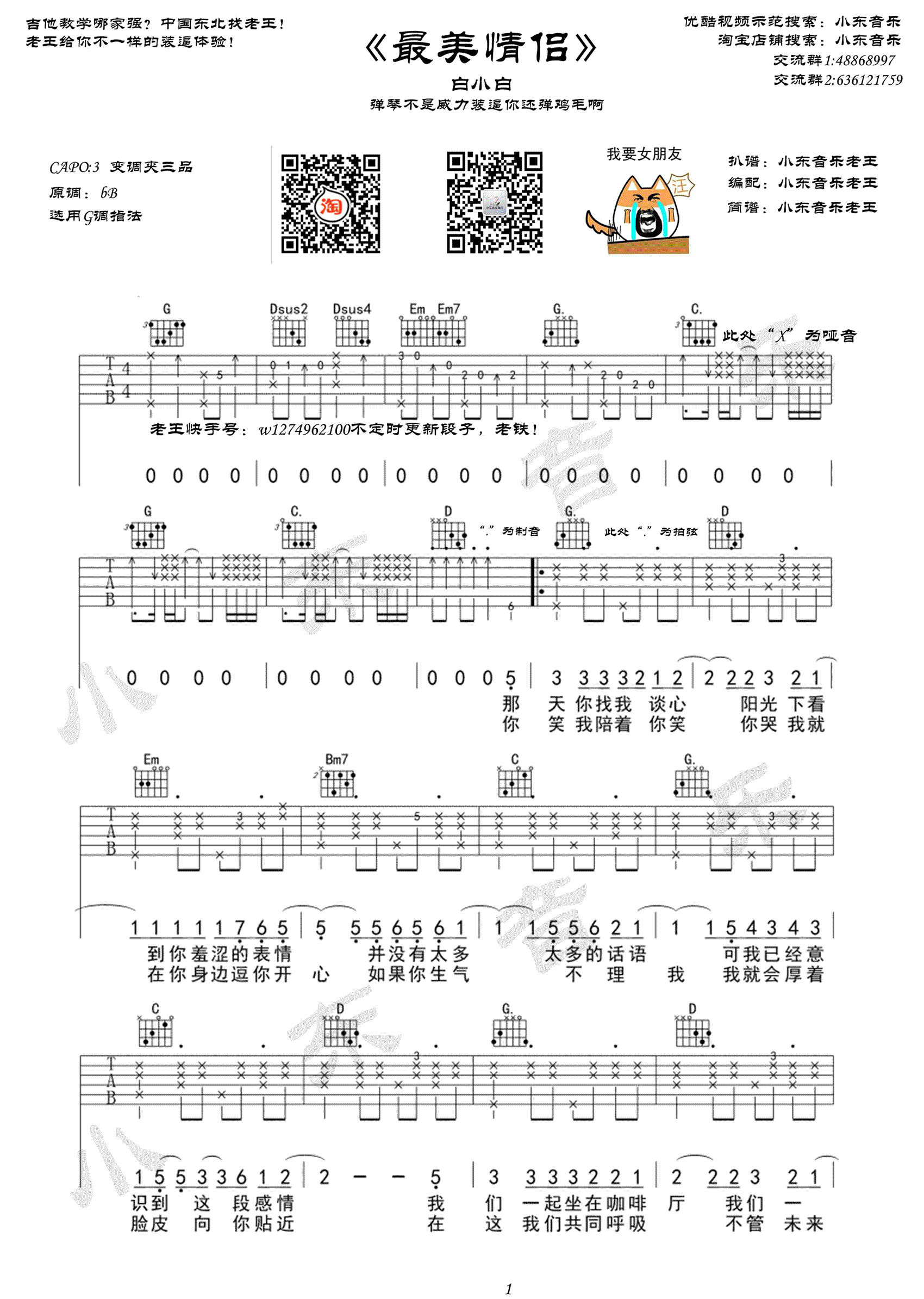 曲谱介绍: 最美情侣吉他谱,白小白演唱,变调夹三品位置,选用G调指法,最美情侣六线谱,一首非常好听的情歌,完整版四张图片谱,感谢小东音乐编配出品,91吉他谱推荐上传。 全网爆红的爱情歌曲《最美情侣》,旋律悦耳动听,歌词直白上口,是当前网络平台传唱率超高的魔性洗脑神曲。