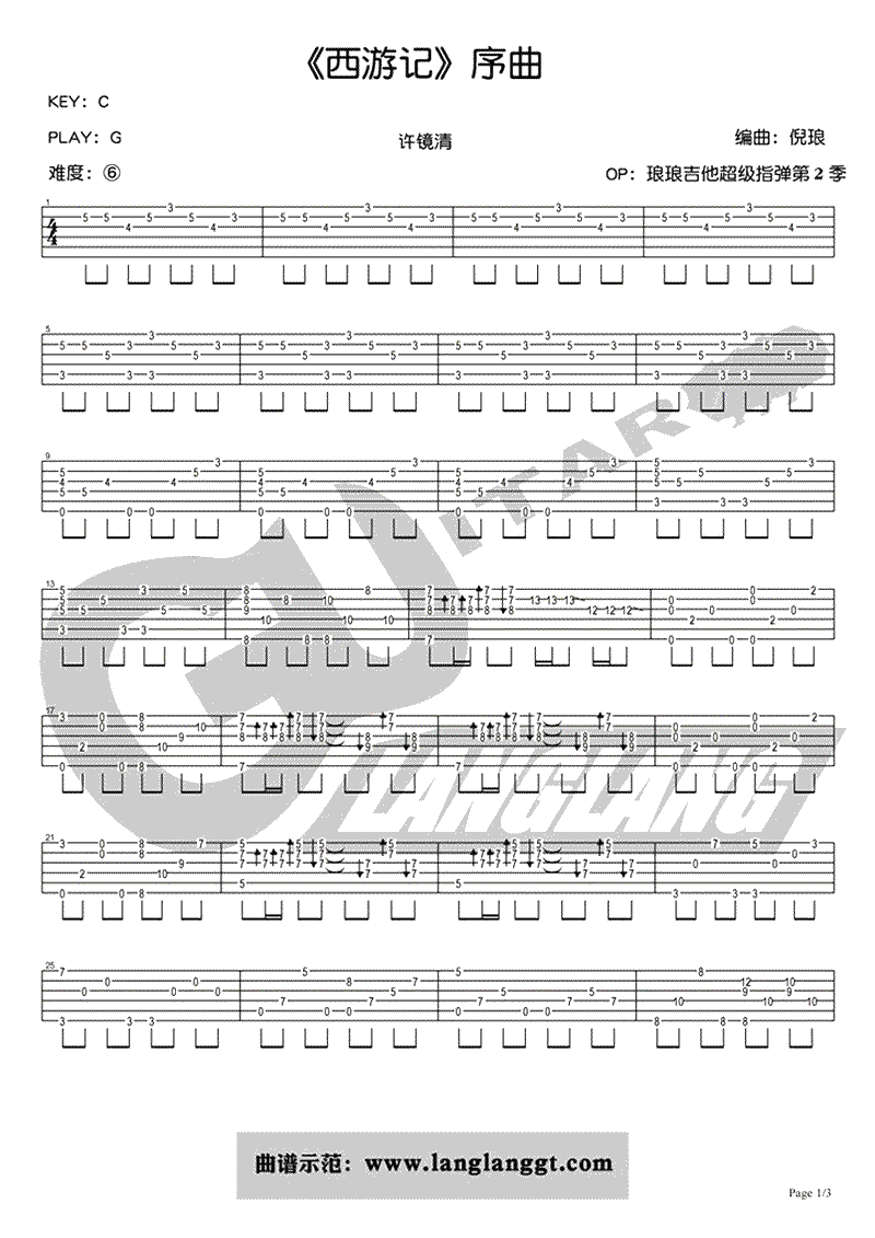 曲谱介绍: 云宫迅音指弹谱,电视剧《西游记》片头曲,原曲C调,选用G调指法,云宫迅音吉他独奏谱,三张图片谱。曲谱由琅琅吉他编配,并提供云宫迅音吉他指弹视频演示。86版《西游记》开头的序曲《云宫迅音》。由著名音乐大师许镜清所作,被誉为中国电子音乐鼻祖。经典的曲目,儿时的记忆是否涌上心头?