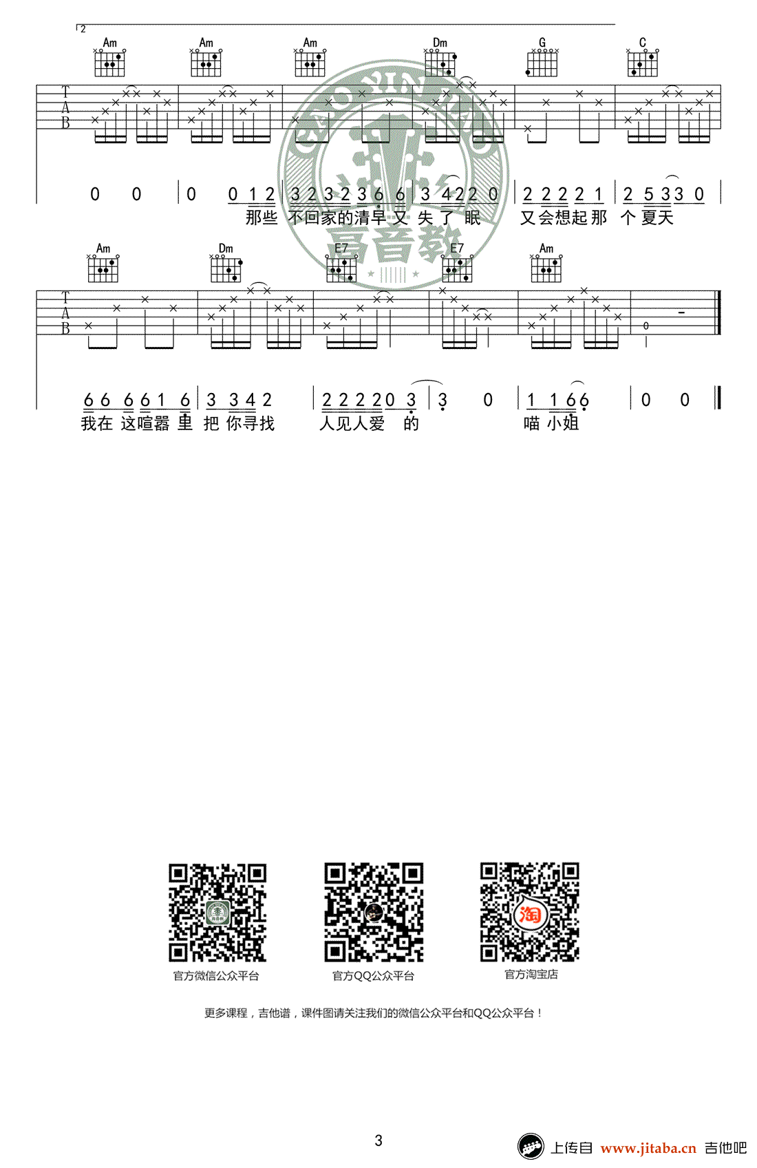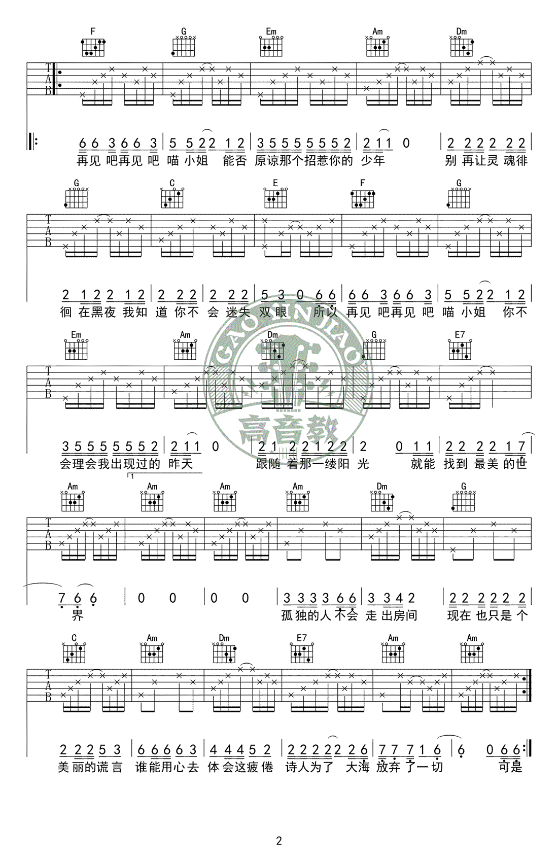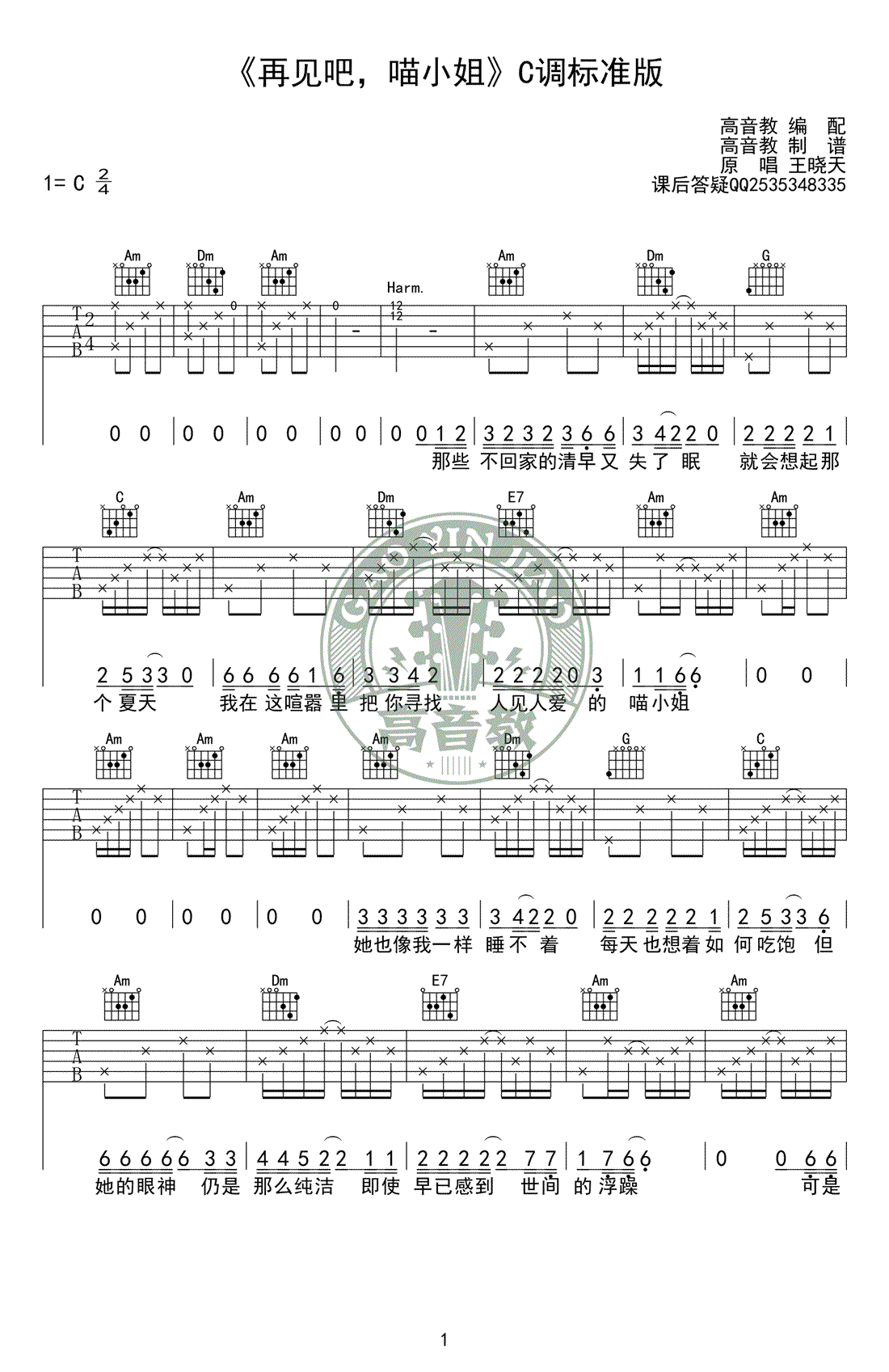 曲谱介绍: 王晓天《再见吧喵小姐》吉他谱,C调标准版,三张高清图片谱。《中国好歌曲》优秀原创民谣歌曲,再见吧喵小姐六线谱,高音教编配出品,91吉他谱上传推荐。整首歌曲比较简单,没有大的难点,掌握好两段右手分解节奏型基本上就能够完成了学习了,琴友们可以参照猴哥老师的弹唱教学进行练习。