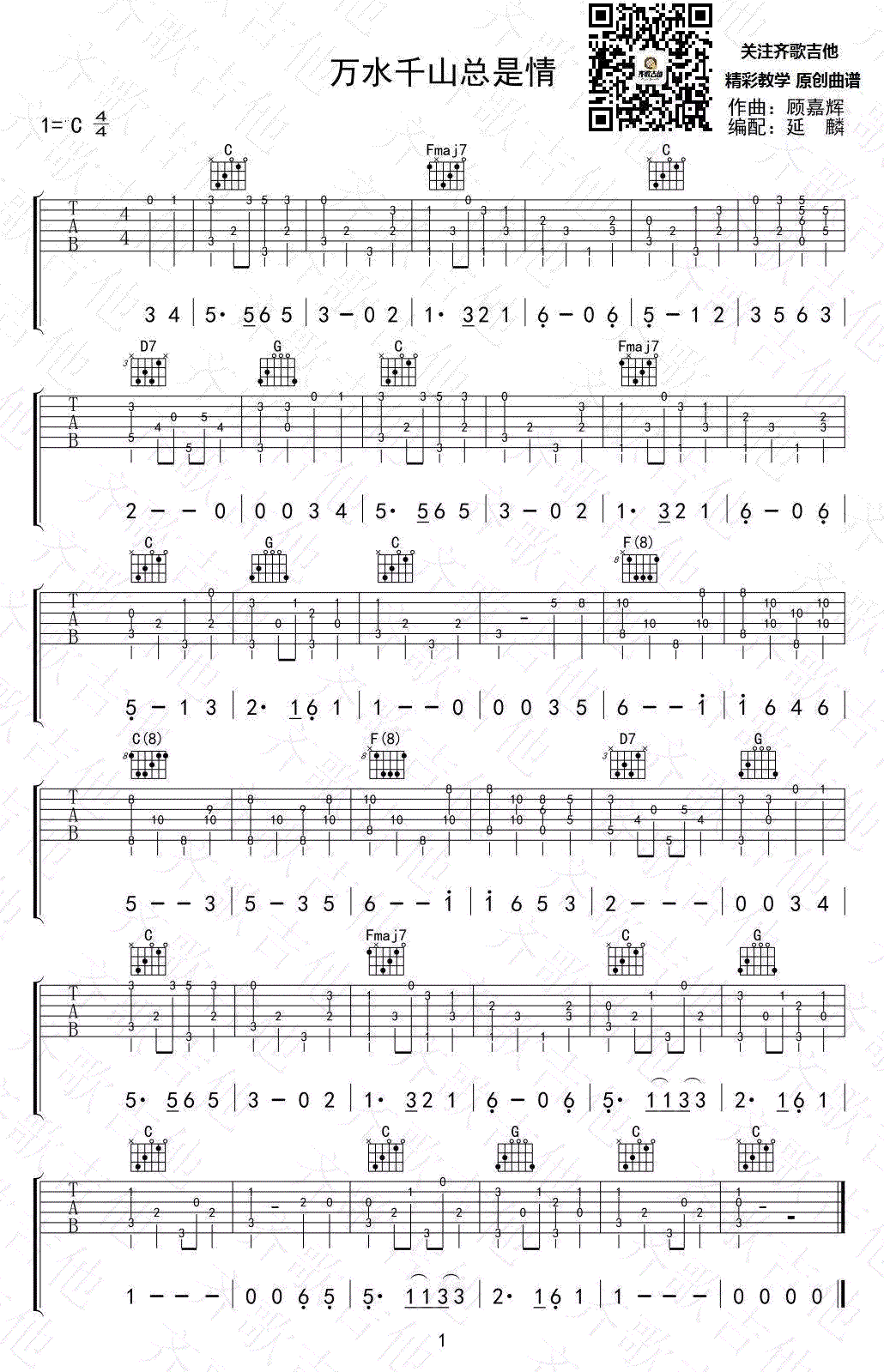曲谱介绍: 万水千山总是情吉他谱指弹版,C调指法,汪明荃演唱的的一首经典粤语歌曲,香港同名电视剧主题曲,万水千山总是情吉他独奏谱,六线谱图片格式,延麟编配,齐歌老师提供吉他指弹视频演示。 本曲为典型的美式乡村指弹风格,低音交替跳动,有时候是根音三音,有时候是五音三音,也有时候是根音加根音,有时候还会使用转位。比如D和弦就常常的是先弹5弦的A而不是4弦的D。右手要使用闷音把低音弦闷上,拇指使用了指套,以让声音更具颗粒感。