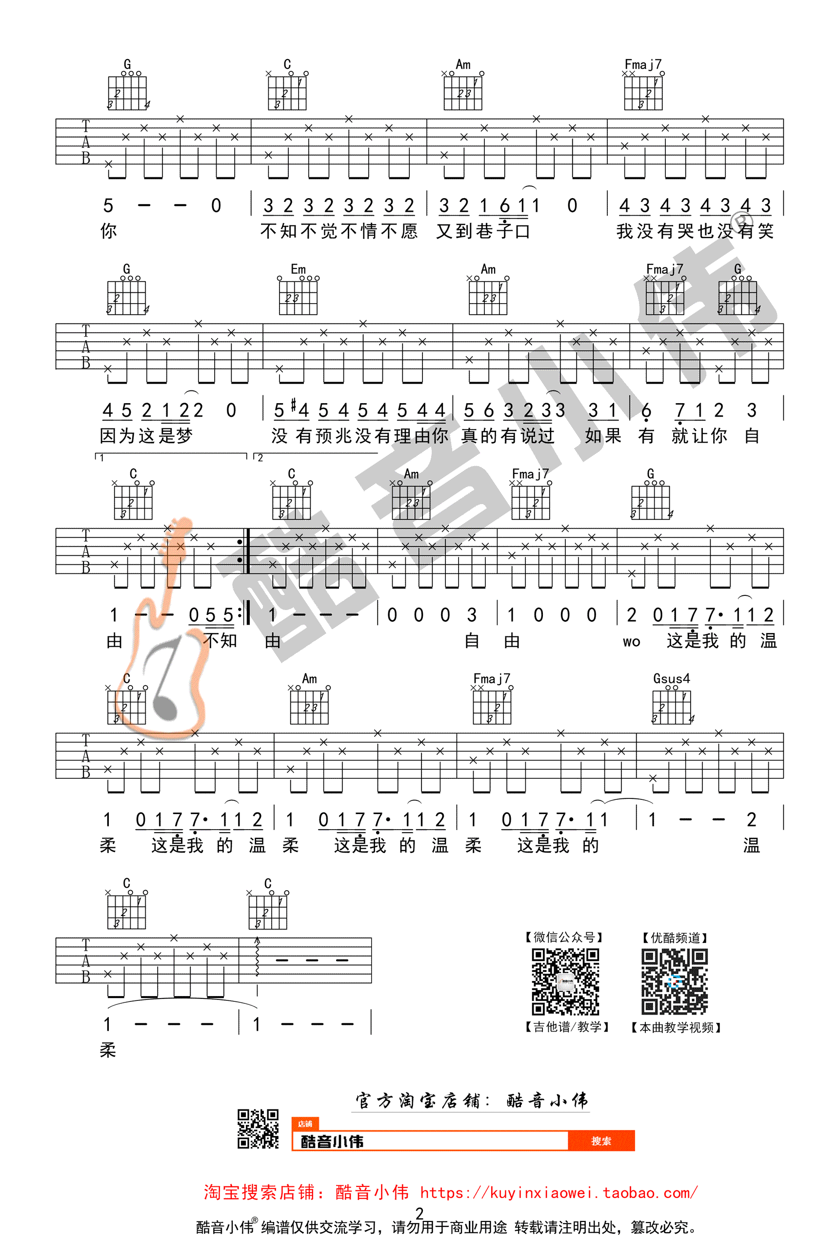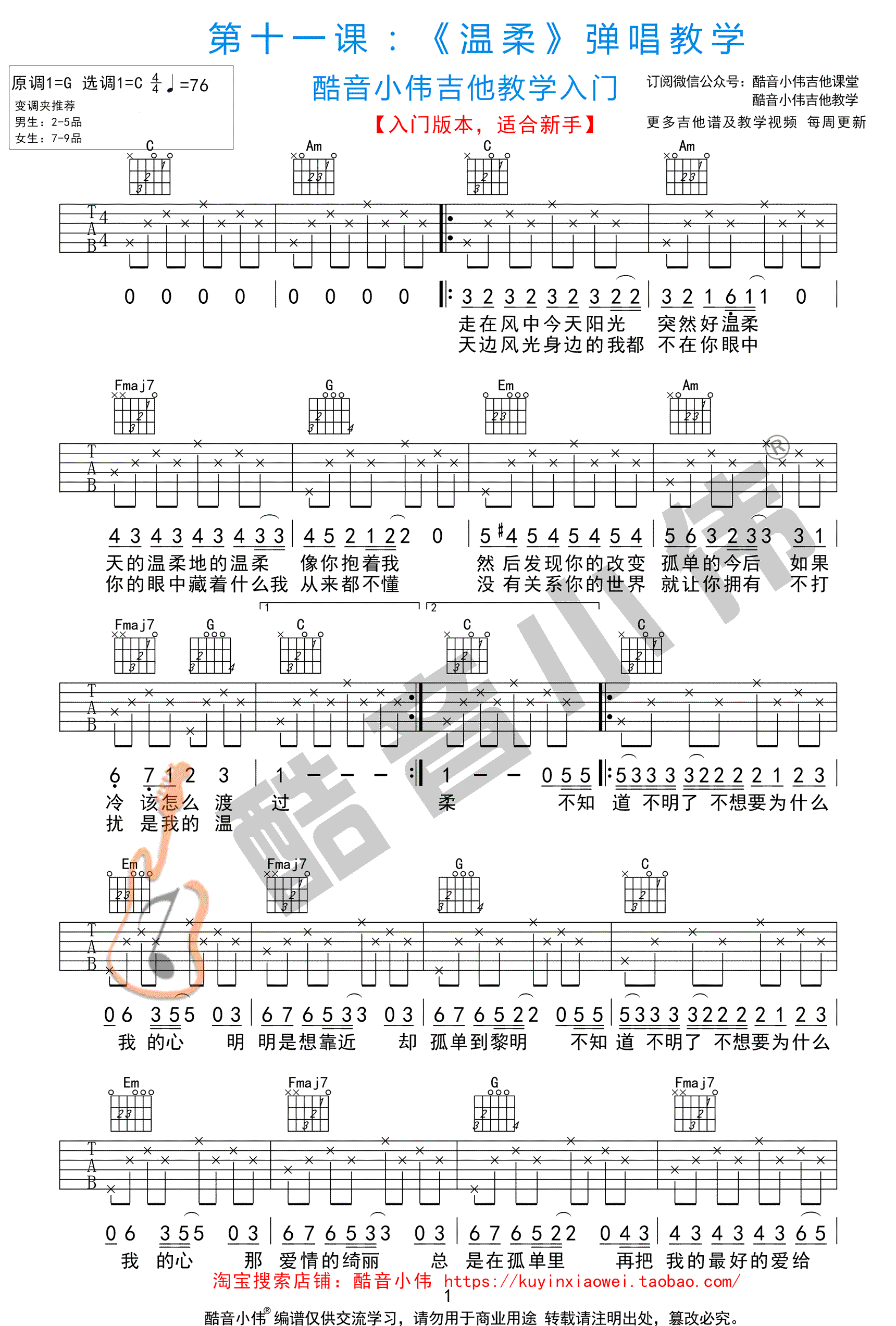 曲谱介绍: 五月天《温柔》吉他谱,这首歌原调G,选用C调编配,变调夹男生2-5品,女生可以7-9品。温柔六线谱,高清图片弹唱谱,本曲谱为入门版本,适合新手。感谢酷音小伟提供曲谱和《温柔》弹唱教学视频。学习歌曲弹唱的步骤,第1步:熟练弹会此首歌曲的和弦伴奏,第2步:能够熟练清唱出此首歌曲,第3步:弹唱结合此歌曲。必须要掌握的知识点,通过本曲的练习掌握4/4拍分解伴奏的歌曲的弹唱结合方法。   《温柔》吉他谱简单入门版本: