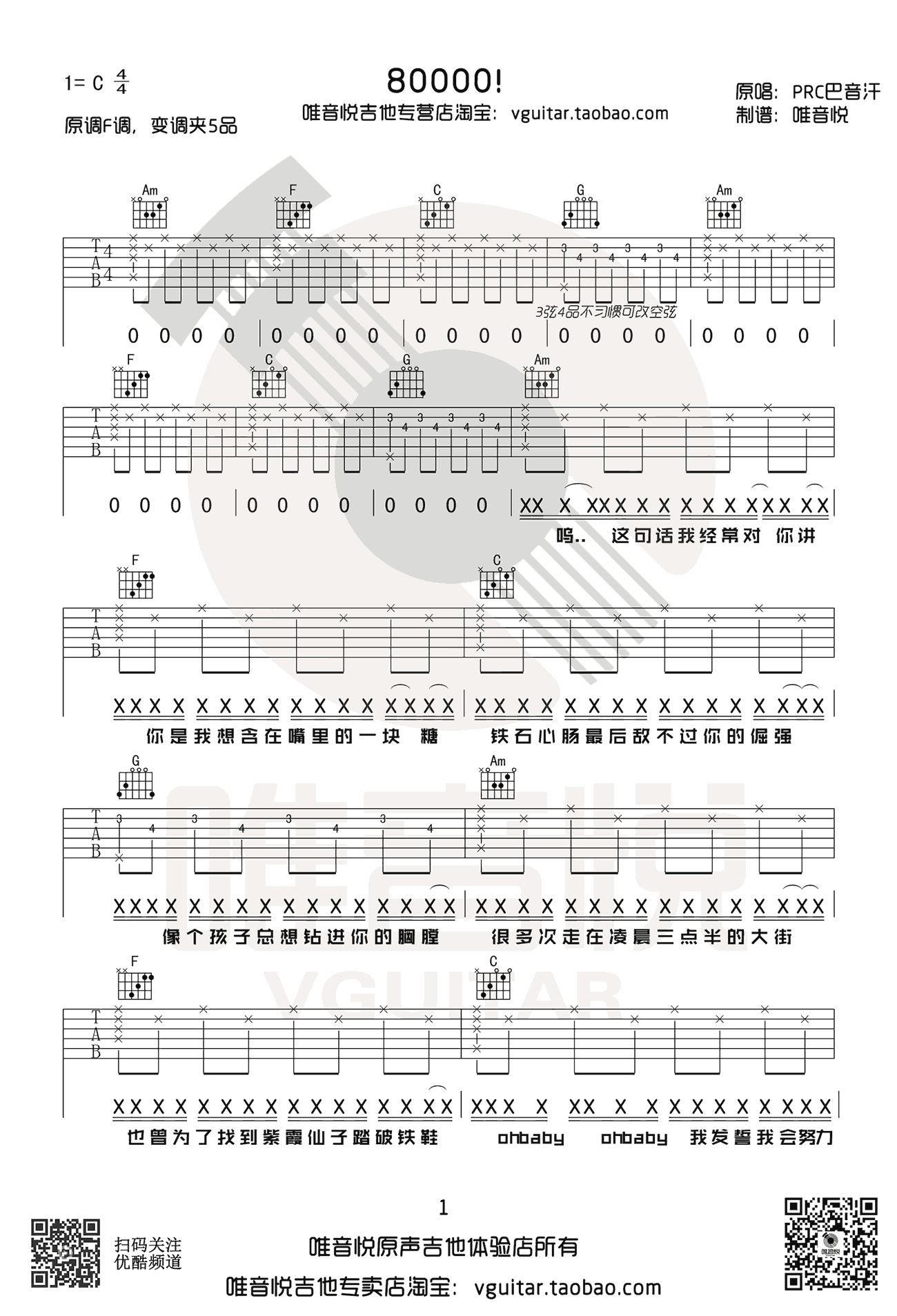 曲谱介绍: 巴音汗《80000》吉他谱,原调F调,变调夹5品,C调指法编配,80000六线谱,高清弹唱谱,感谢唯音悦出品分享,91吉他谱网站上传推荐。 慵懒的声音配合异常温柔的琴音伴奏,欲望被表达的清晰直接,却让人莫名心安,出乎意料的温暖。歌词露骨,简单而直接,前奏很好听。 曲子很短1”48秒适合循环播放。 歌手叫巴音汗,他女友姓万,所以歌名叫“80000”。 片头片尾的英文对话部分来自于rook1e的《i want to love you but i can't》