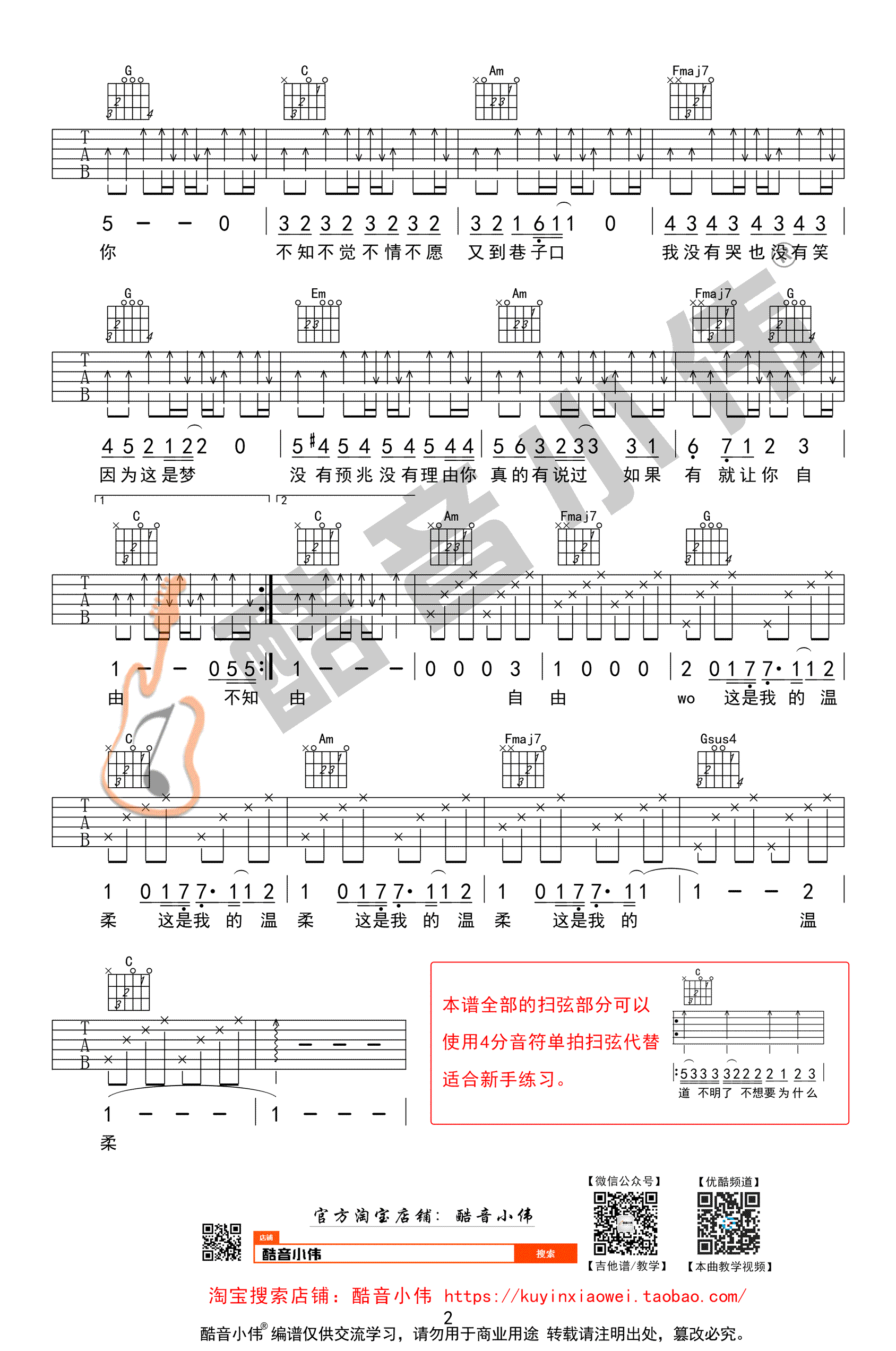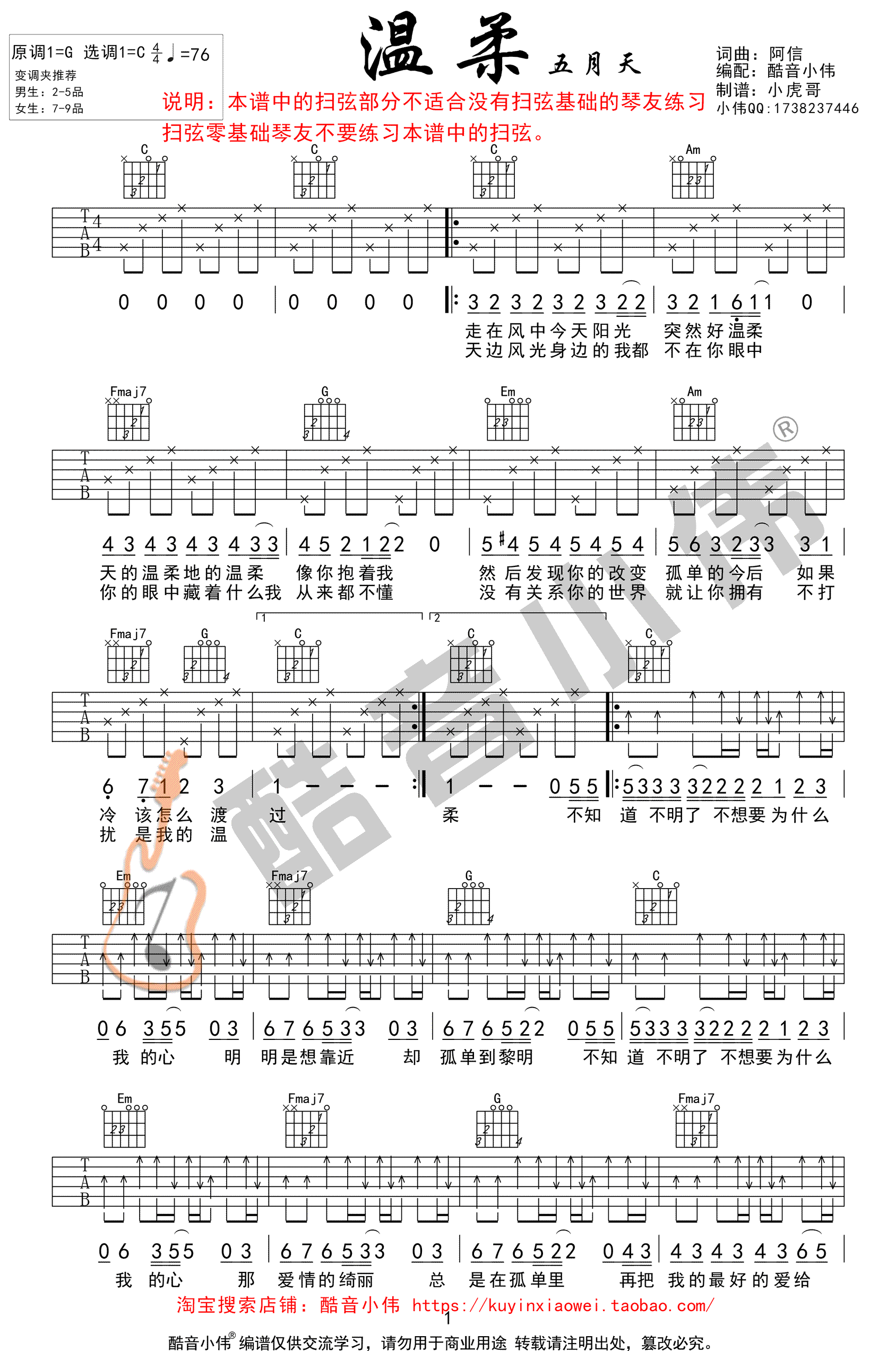 曲谱介绍: 五月天《温柔》吉他谱,C调弹唱,本曲谱适合有一定扫弦基础的琴友,带有复杂扫弦伴奏型,感谢小伟老师编配,在本次的编配中,由两把吉他完成,如果有两个琴友可以进行组合弹奏,使得音色更加丰富饱满。本曲谱作为伴奏吉他2弹奏,扫弦视频教学在17分54秒开始。吉他伴奏1可以参考91吉他谱网站的相关曲谱温柔吉他谱简单版。