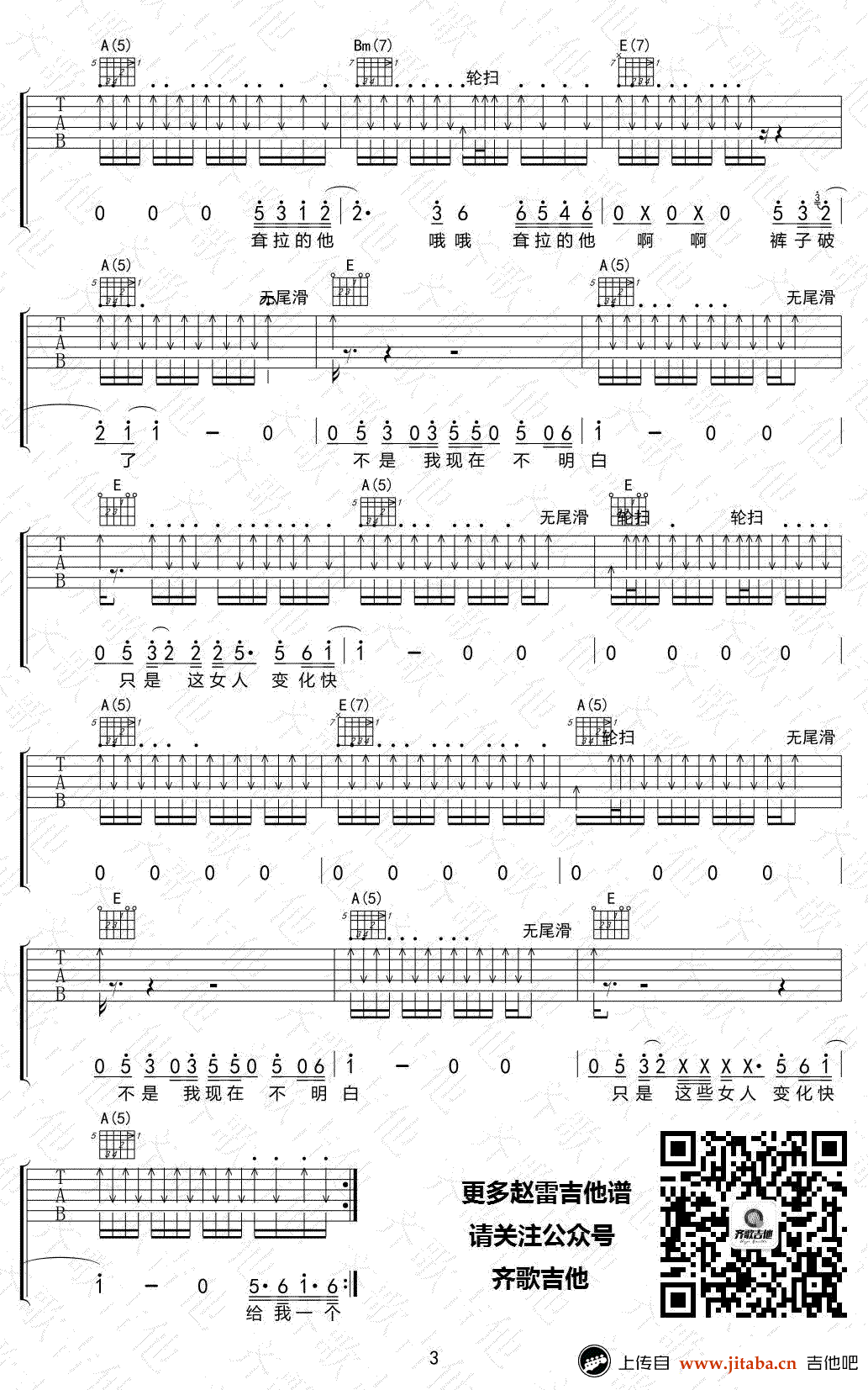 曲谱介绍: 赵雷《夏天》吉他谱,A调指法编配,夏天六线谱,三张高清图片弹唱谱。董路编配,91吉他谱上传分享。这是一首关于夏天的歌曲,轻松幽默的唱出可爱憨萌的男生,在面对夏日街头清凉美女时的害羞心情。 弹唱主要用扫弦,加上哑音的弹法。即左手虚按,把按弦的力度稍稍抬起来,让琴弦不能正常发音;另外,谱子上是16分音符,不过实际上歌曲是摇摆节奏。也就是说,四个音并不是每个音平均占1/4。而是前两个音后两个音各占半拍,而这两个音,前面的音占2/3,后面的占1/3。