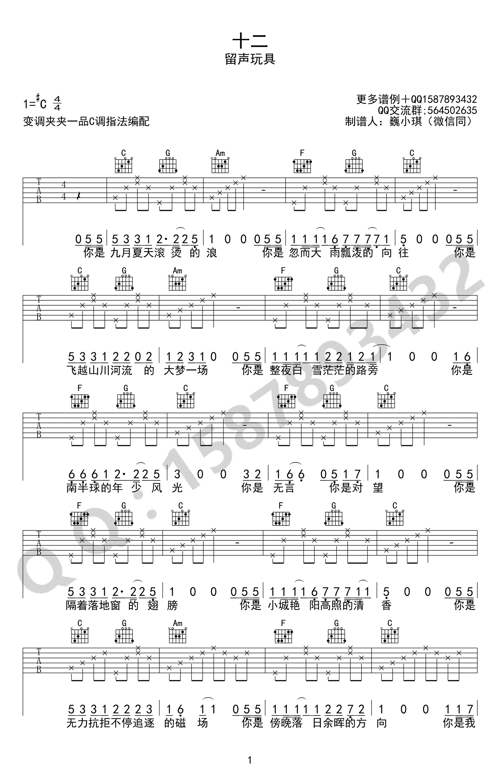 十二吉他谱 - 留声玩具 - C调吉他弹唱谱