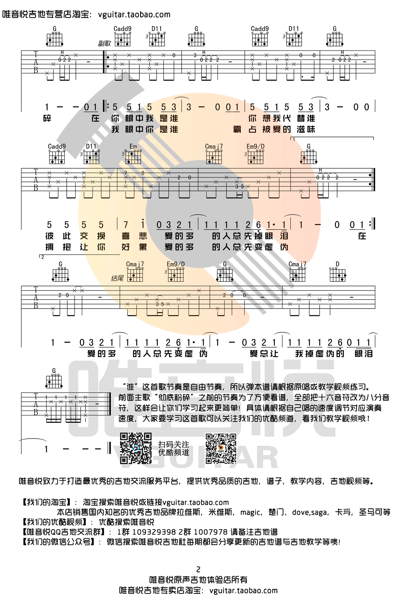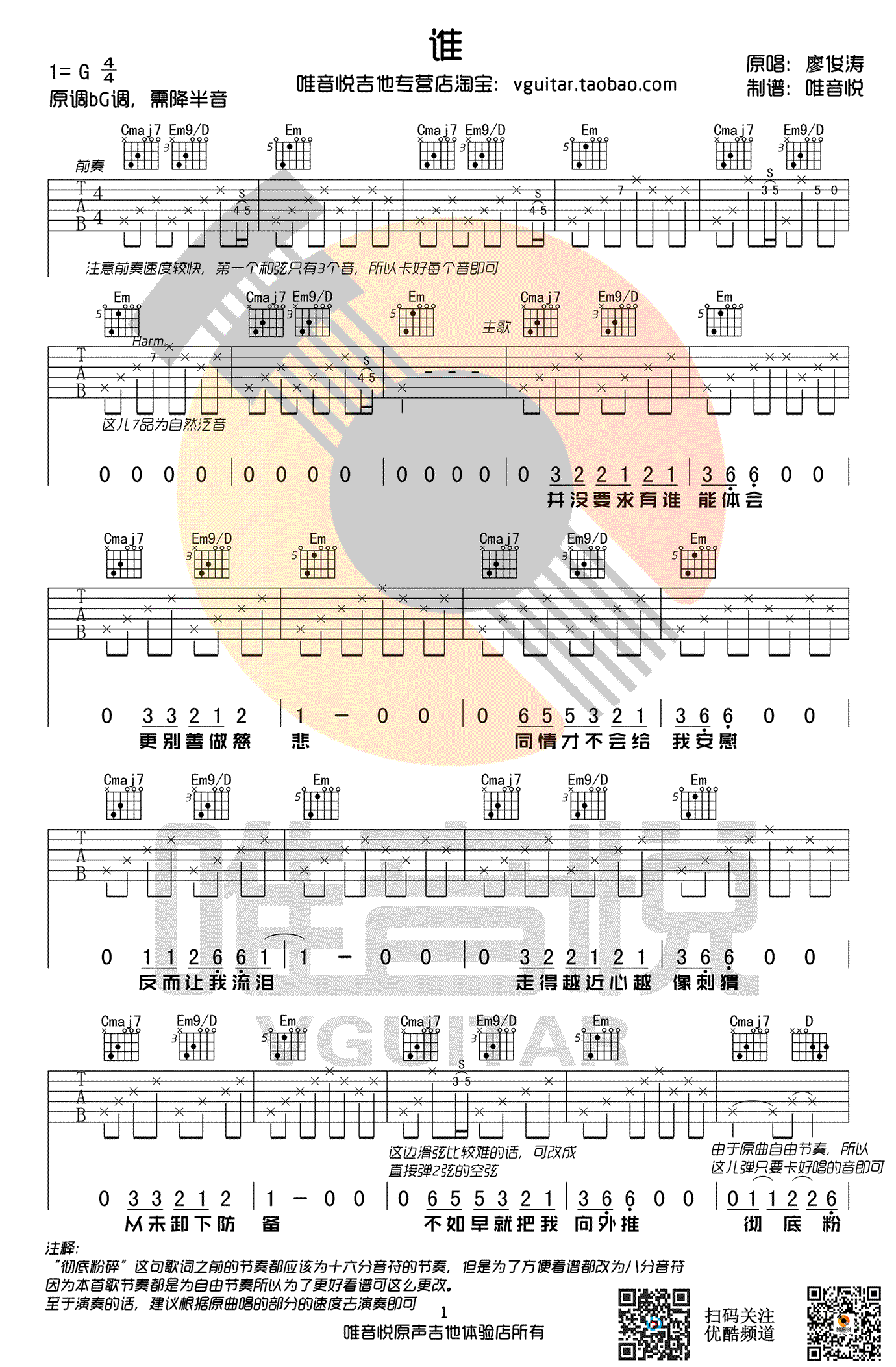 曲谱介绍: 廖俊涛谁吉他谱,G调bG,降半音调弦,G调指法简单版,明日之子节目廖俊涛词曲演唱的原创歌曲,《谁》六线谱,两张高清图片谱,感谢唯音悦出品,91吉他谱网站上传分享。 大家稍微注意一下本谱与以往有点不太一样,因为这首歌节奏是自由节奏,所以也为了方便看谱,主歌与前奏的节奏都标为8分音符,但实际演奏需要根据原曲与自己平时唱的速度来弹, 最主要唱与弹的音能对应上即可了,大家请注意看谱子的注释哦 。