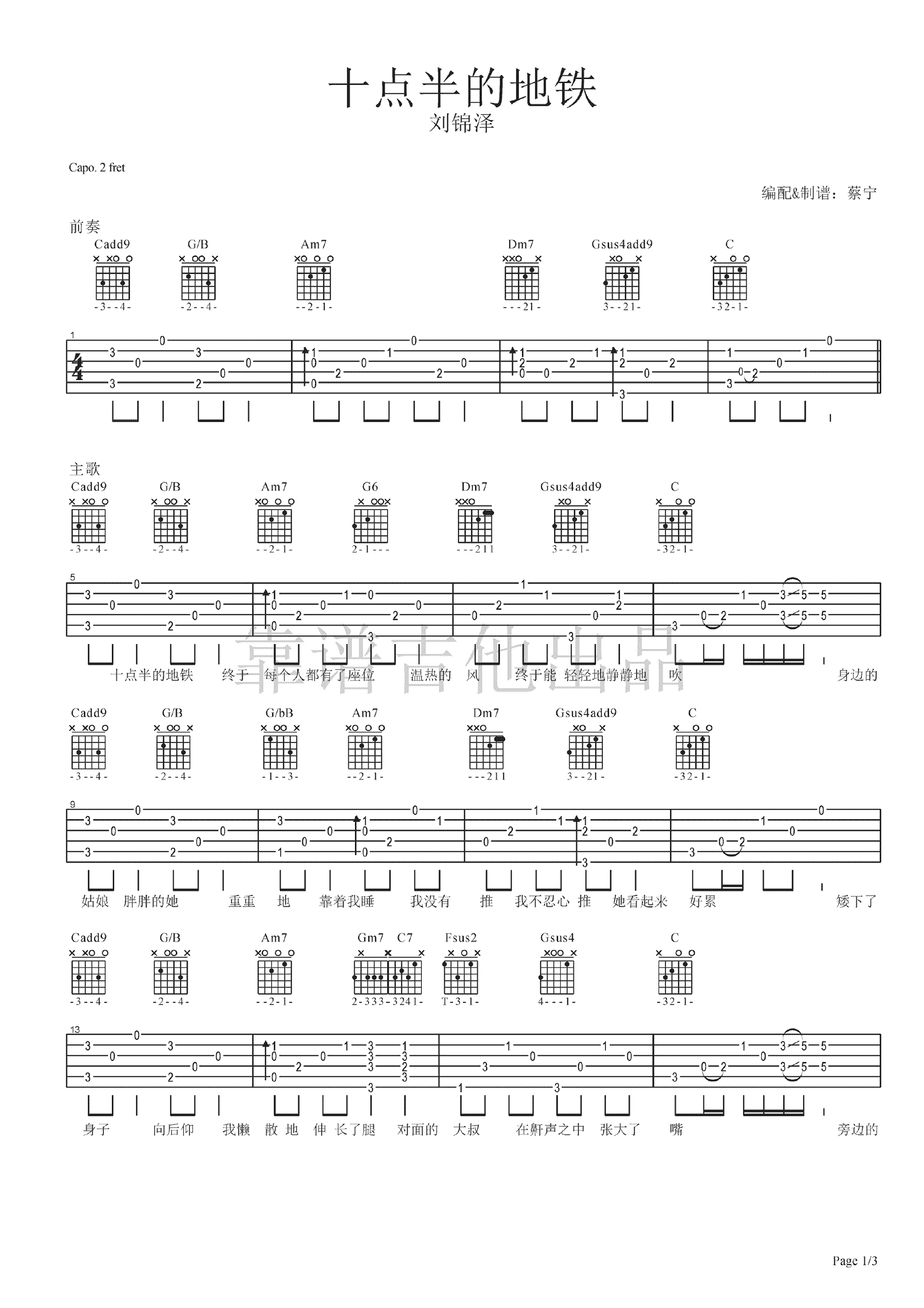 曲谱介绍: 十点半的地铁吉他谱,中国好歌曲刘锦泽词曲演唱,十点半的地铁六线谱,Capo夹二品,三张高清图片谱。本曲谱为靠谱吉他蔡宁老师编配,为方便琴友们练习,随谱附上吉他弹唱演示视频。