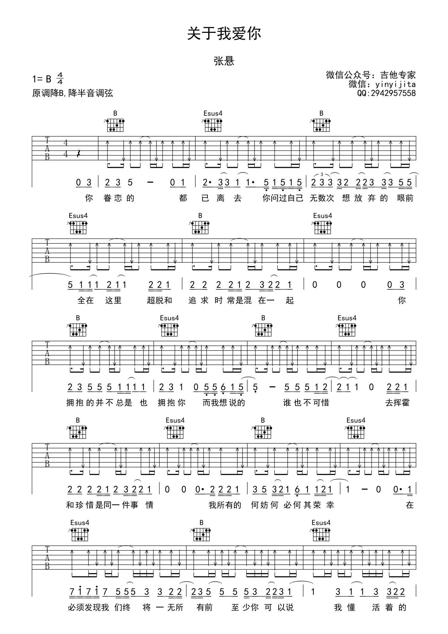 曲谱介绍: 关于我爱你吉他谱,张悬演唱的一首歌曲,原调降B调,降半音调弦。一把吉他,简单的唱出自己的内心,没有太多的情绪起伏,却也能勾起许多往事。