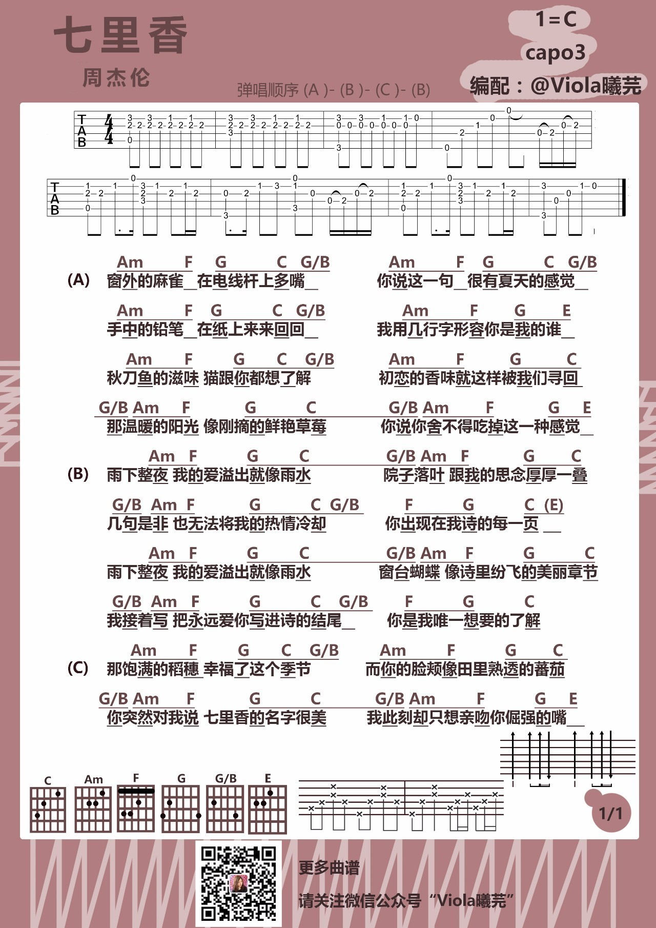 曲谱介绍: 周杰伦《七里香》吉他谱,C调指法,Capo夹三品,高清图片谱。七里香吉他弹唱谱,曦芫编配并提供弹唱示范视频。91吉他谱上传收藏。 曦芫说明:前面两行是前奏(也就是我视频弹的那个前奏,如果只想弹那个旋律部分可以从第四小结最后一拍那里开始弹) 下划线划住的和弦表示这X个和弦是在一小节里弹完(例如:Am  F,表示这两个和弦要在一个小节里弹完各占一半) 下面的节奏型-分解是主歌(注意节奏型有两小结),扫弦是副歌。 主歌可以完全按照节奏型的标识来弹,G C G/B,这里在主歌的分解节奏型里可以看出G占两拍(一共占半小结)来C和G/B是各占一拍(一共占半小结) 副歌遇到G C G/B由于不知道怎么打双下划线的原因(哭)所以特别说明一下:C和G/B的半小结的节奏型可以连起来弹做:下下上   下下上,那么前面的G就是:下   下下上。
