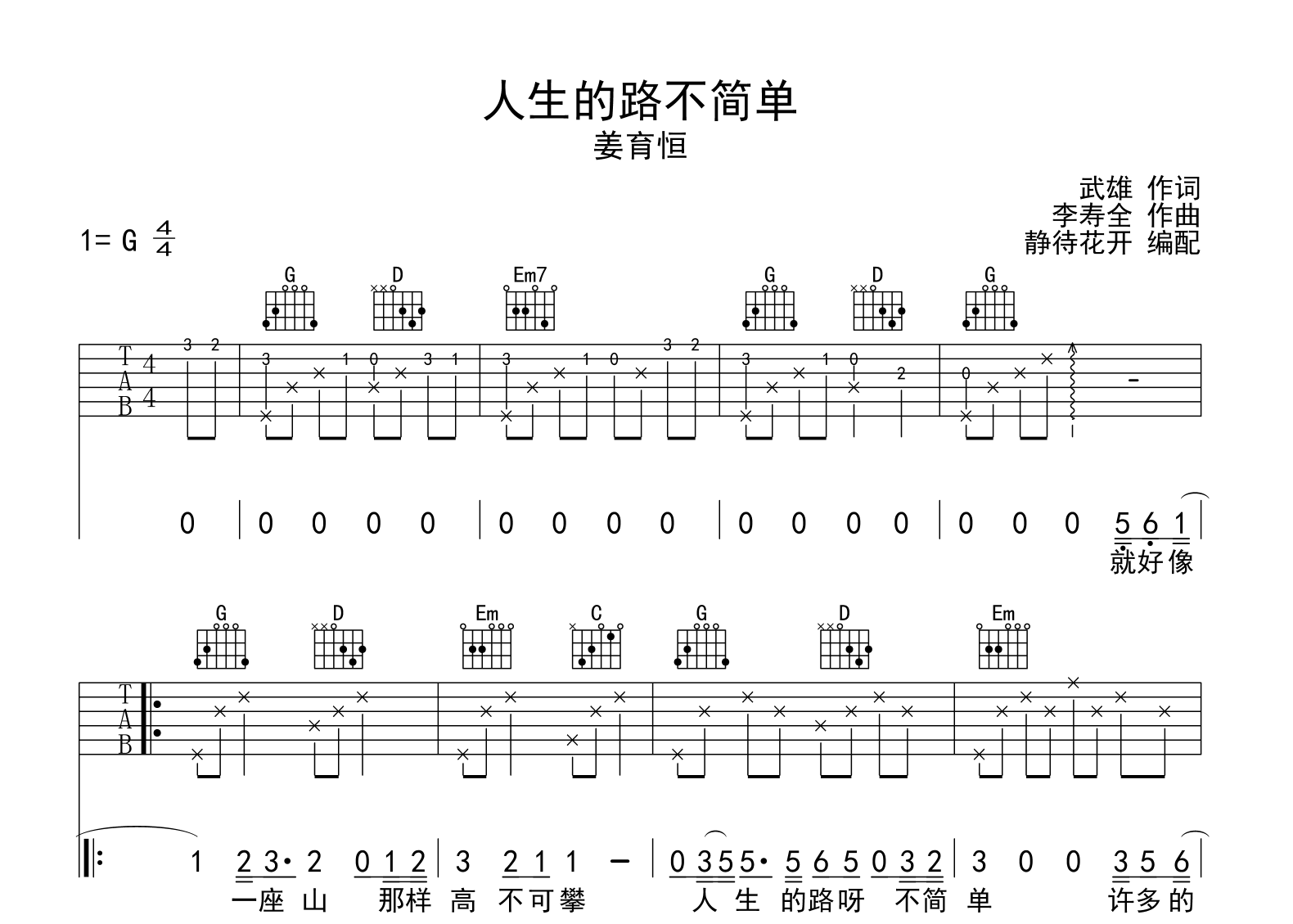 人生的路不简单吉他谱 - 姜育恒 - G调吉他弹唱谱