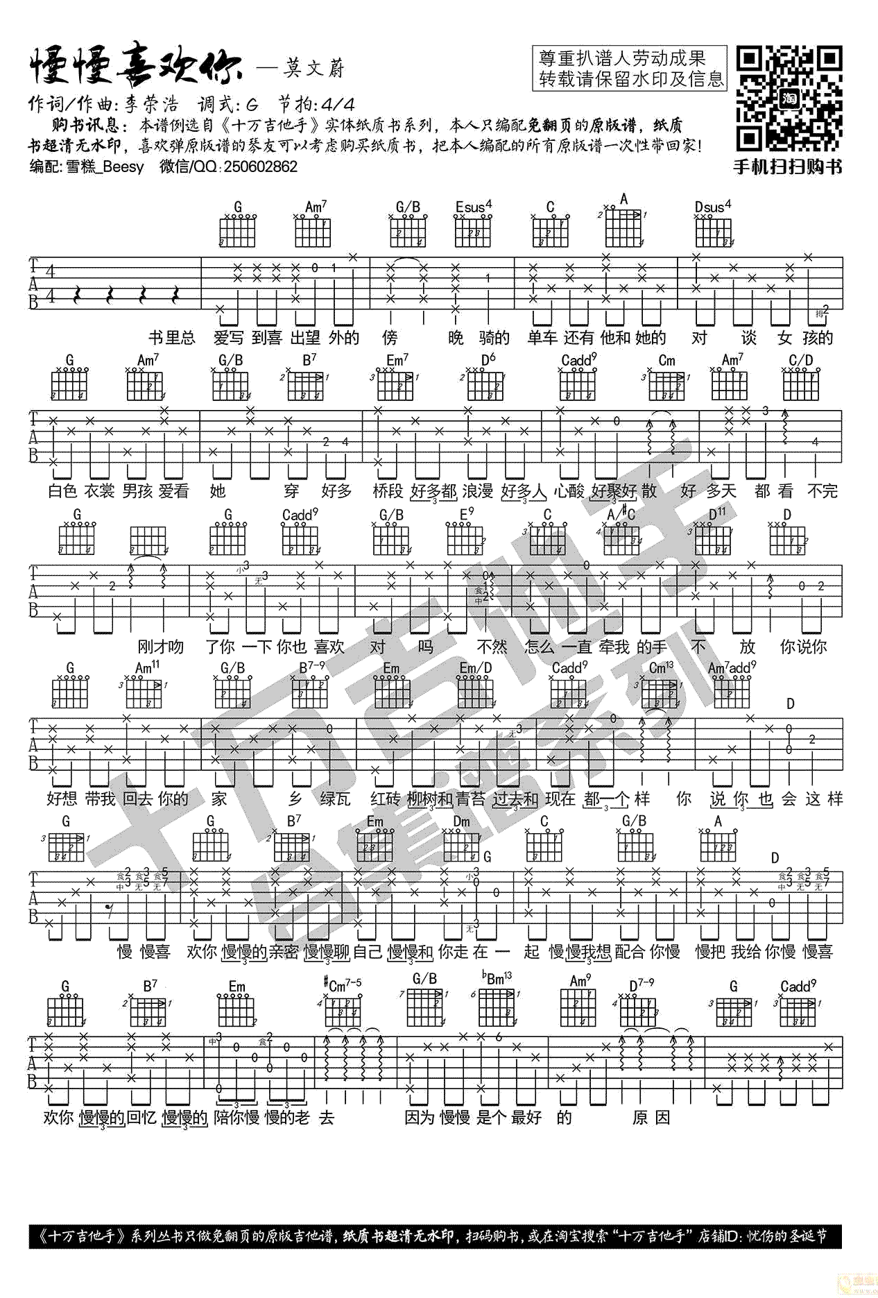 曲谱介绍: 慢慢喜欢你吉他谱,莫文蔚演唱的一首甜蜜情歌,由李荣浩词曲创作,慢慢喜欢你六线谱,G调弹唱图片谱,感谢雪糕_Beesy编配,91吉他谱上传。