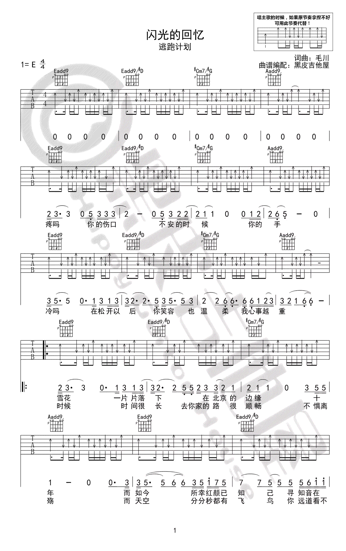 曲谱介绍: 闪光的回忆吉他谱,逃跑计划乐队演唱,原调E调,弹唱谱根据原版编配,和弦和节奏都还原于原版,感谢黑皮吉他屋出品,并带来吉他弹唱教学,视频中老师降半音演示,91吉他谱网站推荐分享。整首歌在四个和弦转换,大家注意多多练习,琴友们可以参照讲解学习起来。