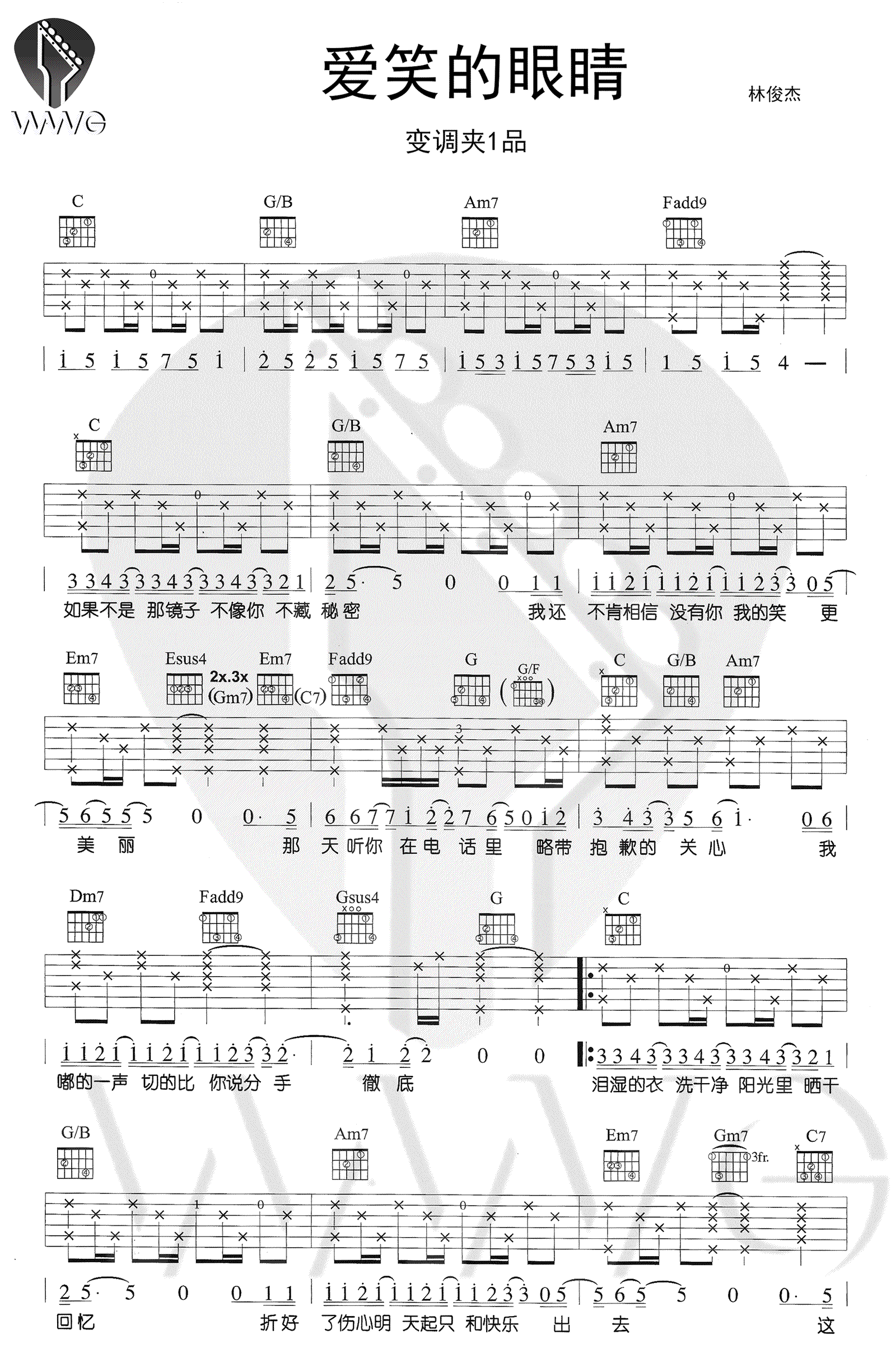 曲谱介绍: 林俊杰《爱笑的眼睛》吉他谱,高清弹唱图片谱,变调夹夹一品,《爱笑的眼睛》六线谱,感谢WWG编配扒谱,91吉他谱网站整理上传。 这首歌曲是林俊杰谱曲,徐若瑄填词演唱的一首歌,林俊杰在《她说》专辑中重新演绎了这首歌曲。也许,原创带来的翻唱,可以更加贴近创作者的本心。《梦想的声音2》节目陈卓璇的《爱笑的眼睛》 版本也给人留下深刻印象。