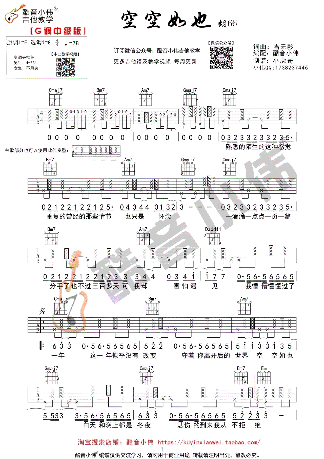 曲谱介绍: 空空如也吉他谱,原调E,选调G,变调夹推荐,男生4-6品,女生不用夹或者降半音调弦。胡66演唱,空空如也六线谱,中级版编配教学,感谢酷音小伟出品,91吉他谱整理上传。喜欢这首热门网络歌曲的琴友们可以参照小伟老师的《空空如也》吉他教学视频学习。整首歌曲的难点不多,大家多熟悉和弦,以及右手伴奏音型的改变和替换。