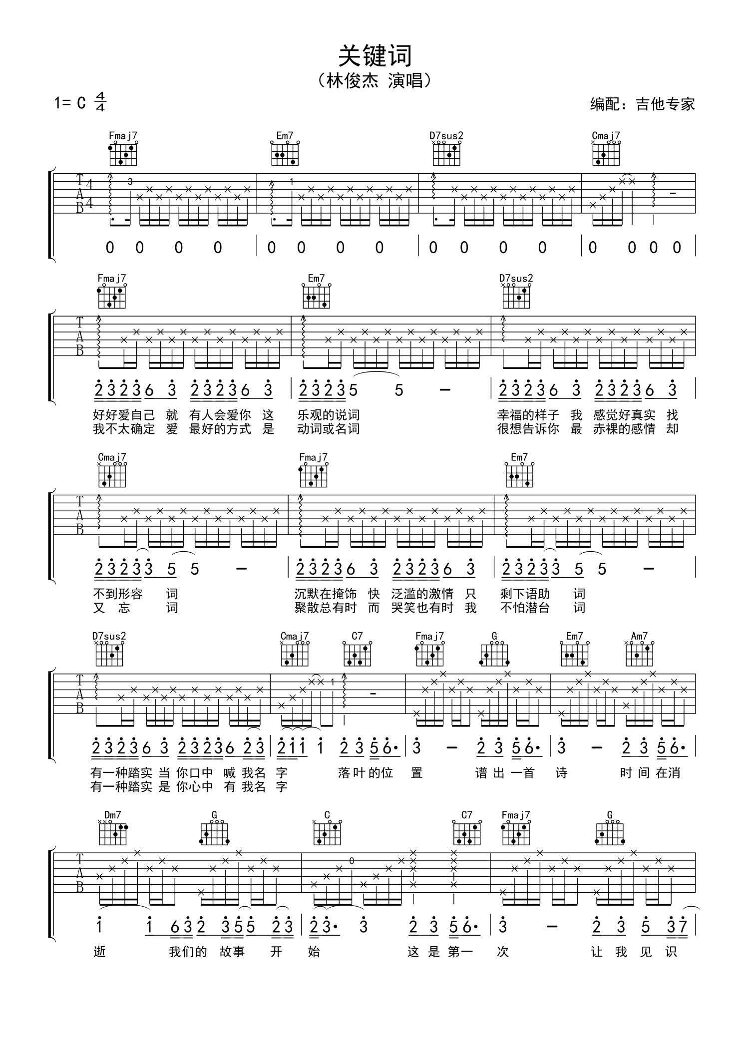 • 关键词吉他谱 - 林俊杰 - C调吉他弹唱谱第1张