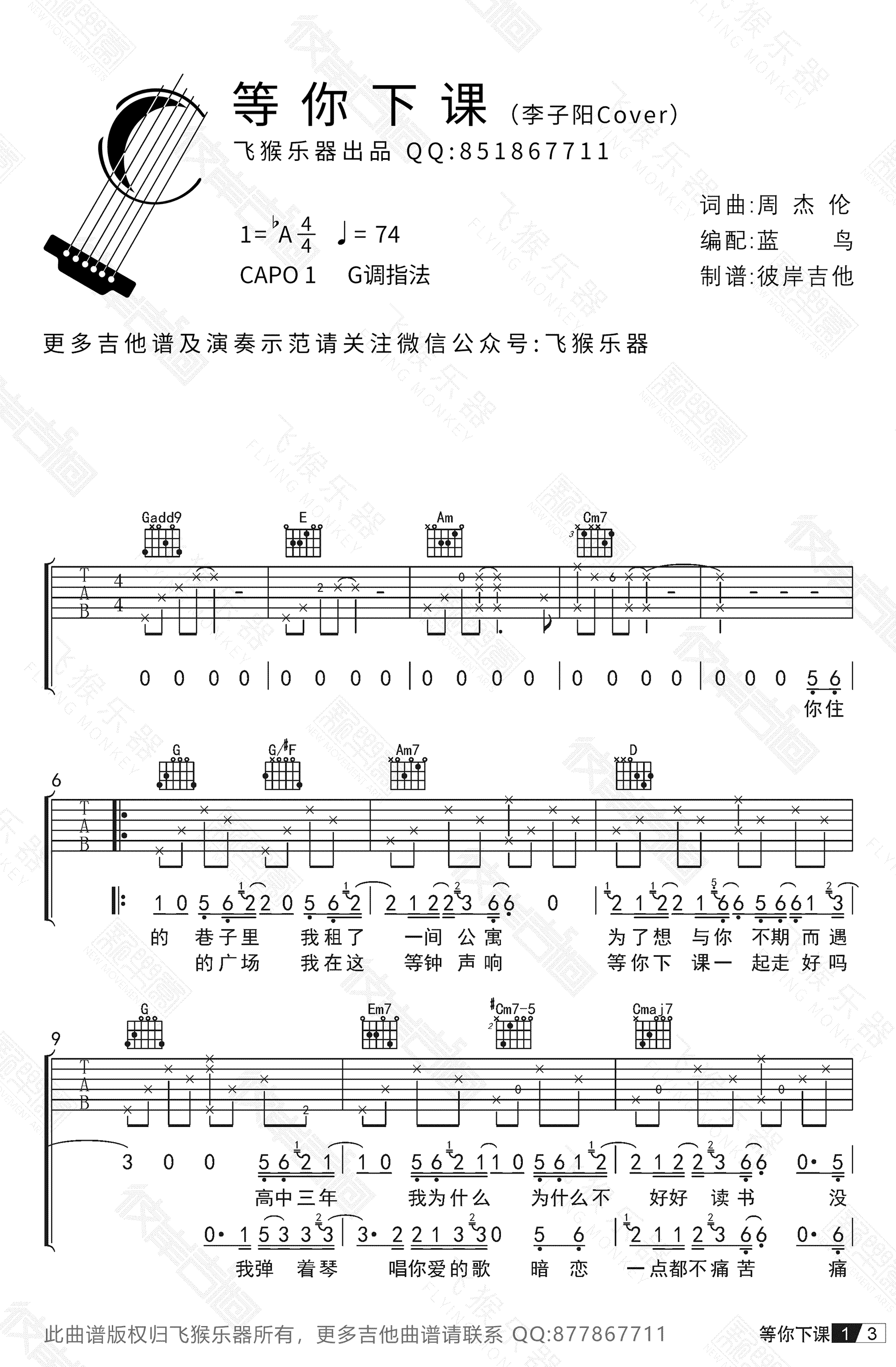 曲谱介绍: 等你下课吉他谱,周杰伦演唱,G调指法,CAPO夹一品,等你下课吉他弹唱谱,三张高清图片谱例。感谢飞猴乐器出品,蓝鸟编配,彼岸吉他制谱,91吉他谱网站上传分享。随谱附上李子阳Cover《等你下课》吉他弹唱视频,琴友们可以参照示范演示练习。