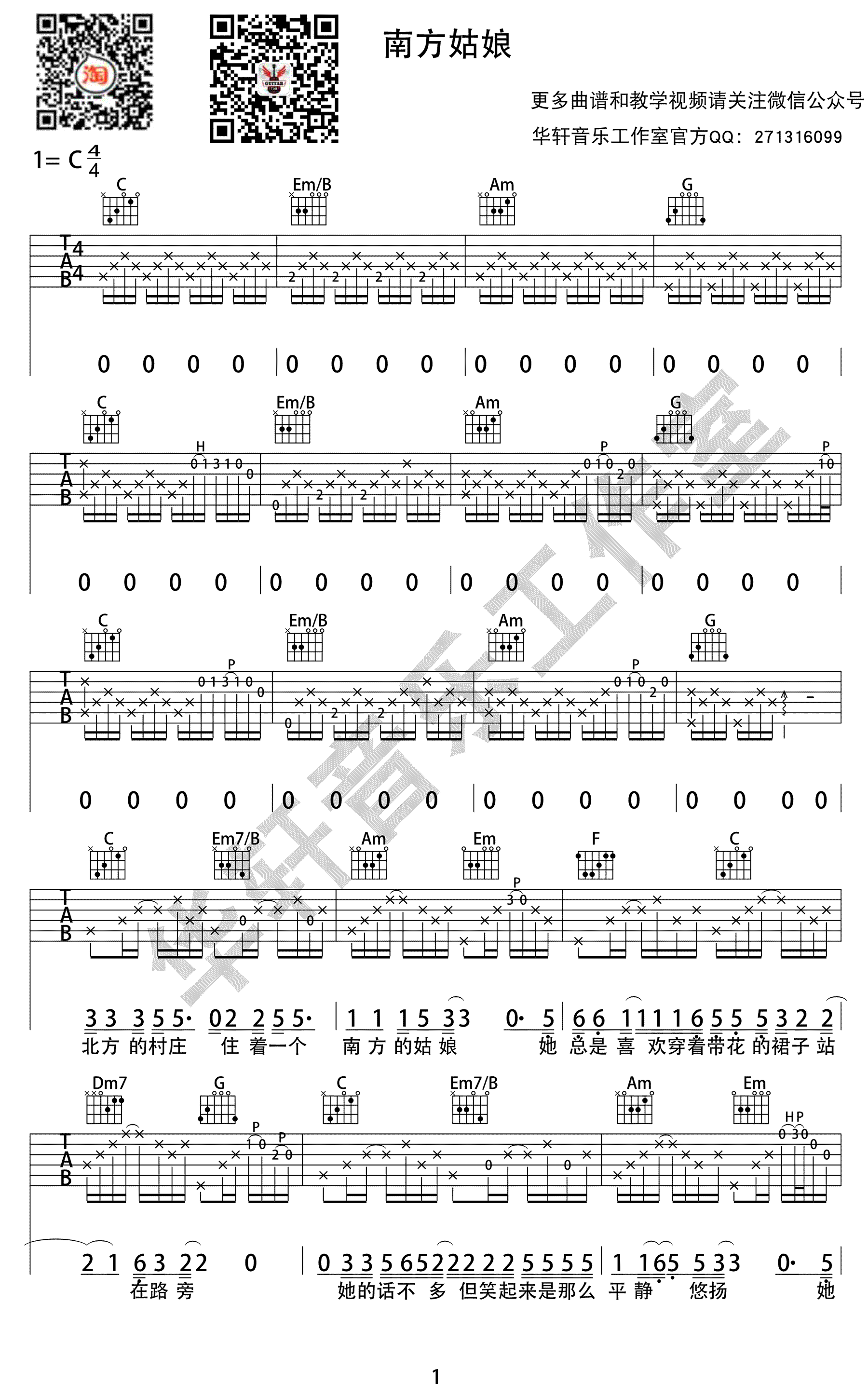 曲谱介绍: 南方姑娘吉他谱,赵雷的代表民谣原创作品,C调指法,四张高清图片谱。南方姑娘六线谱,华轩音乐工作室出品,91吉他谱网站整理上传。 平静悠扬的低吟浅唱,所有的词和旋律就这样徐徐缓缓的晃进心里,开阔叙述中带着温暖与柔情,仿佛看见一位有些惆怅有些迷人的姑娘,穿着缀花的裙子站在路旁,像是张望,像是守候,眼睛里藏着她的故事……