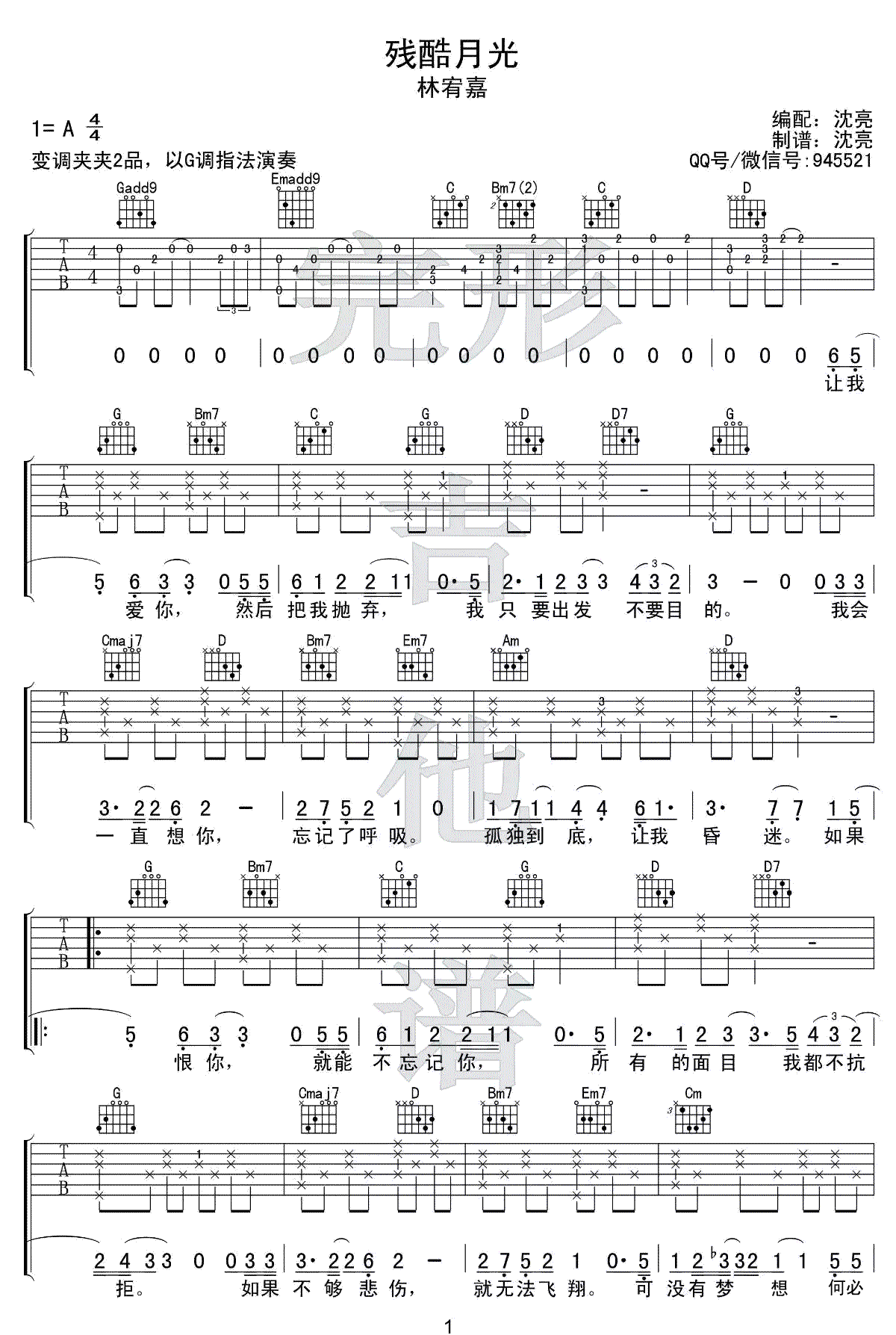 曲谱介绍: 林宥嘉《残酷月光》吉他谱,变调夹夹第二品,以G调指法演奏。残酷月光六线谱,高清弹唱图片谱。感谢完形吉他出品,随谱附上沈亮老师带来的《残酷月光》吉他弹唱视频,方便同学们配合曲谱参照示范演示练习。 本曲谱的版本,以一把吉他编配,模仿钢琴柱式和弦伴奏方式的手法,在整体编配方向上尽量回归原版。该伴奏方式在吉他上的表现简单且灵活,是吉他爱好者必学伴奏手法,在诸多歌曲中都有体现。
