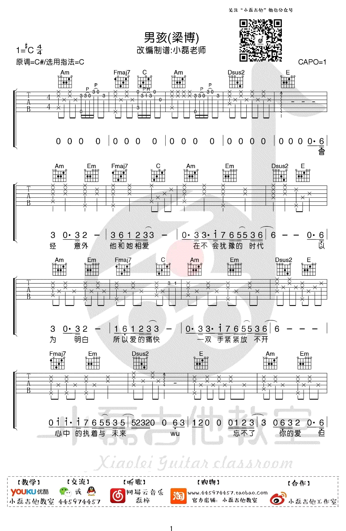 曲谱介绍: 梁博《男孩》吉他谱,选调C调指法,男孩吉他六线谱,配套吉他弹唱和教学视频,高清弹唱图片谱,感谢小磊吉他编配出品,91吉他谱网站推荐上传。这是一首颇为高亢的歌曲,梁博的个人演唱成分加分很多,虽然只有现场版本,但是还是称得上是一首十分震撼的歌曲!老师制作的这个乐谱前奏部分和原版契合度超级高,把原曲中的钢琴音色很完美的转化成吉他演奏,这也是制谱者的智慧所在!16分音符慢切分节奏大家也需要重点理解!