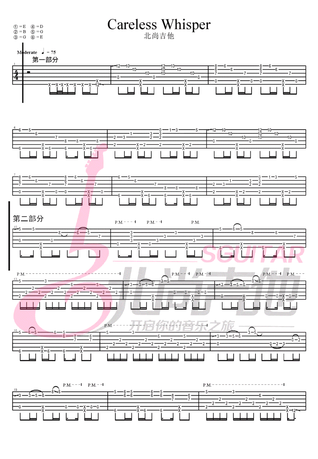 曲谱介绍: Careless whisper指弹吉他谱,经典的旋律,永恒的回忆,无心快语吉他独奏谱,图片谱由尚北吉他编配,91吉他谱网站上传。 英国乐队组合威猛乐队(Wham)的一首经典歌曲,由乔治·迈克尔演唱,指弹吉他版《Careless Whisper》性感迷醉,温暖治愈,呈现这首经典英文歌。