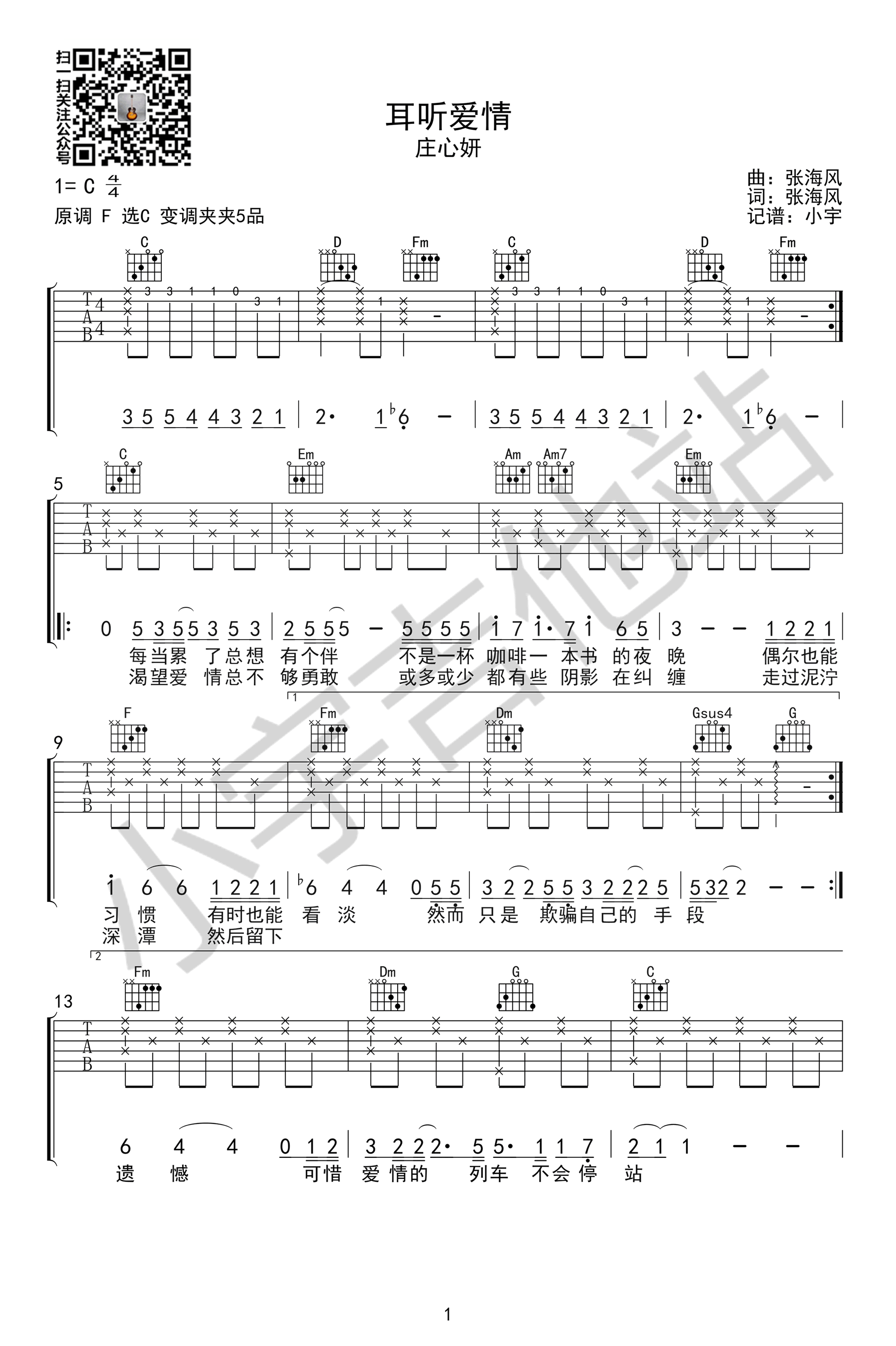 曲谱介绍: 庄心妍《耳听爱情》吉他谱,C调指法编配,变调夹夹第五品。耳听爱情六线谱,高清图片弹唱谱,小宇吉他编配出品,91吉他谱网站上传。