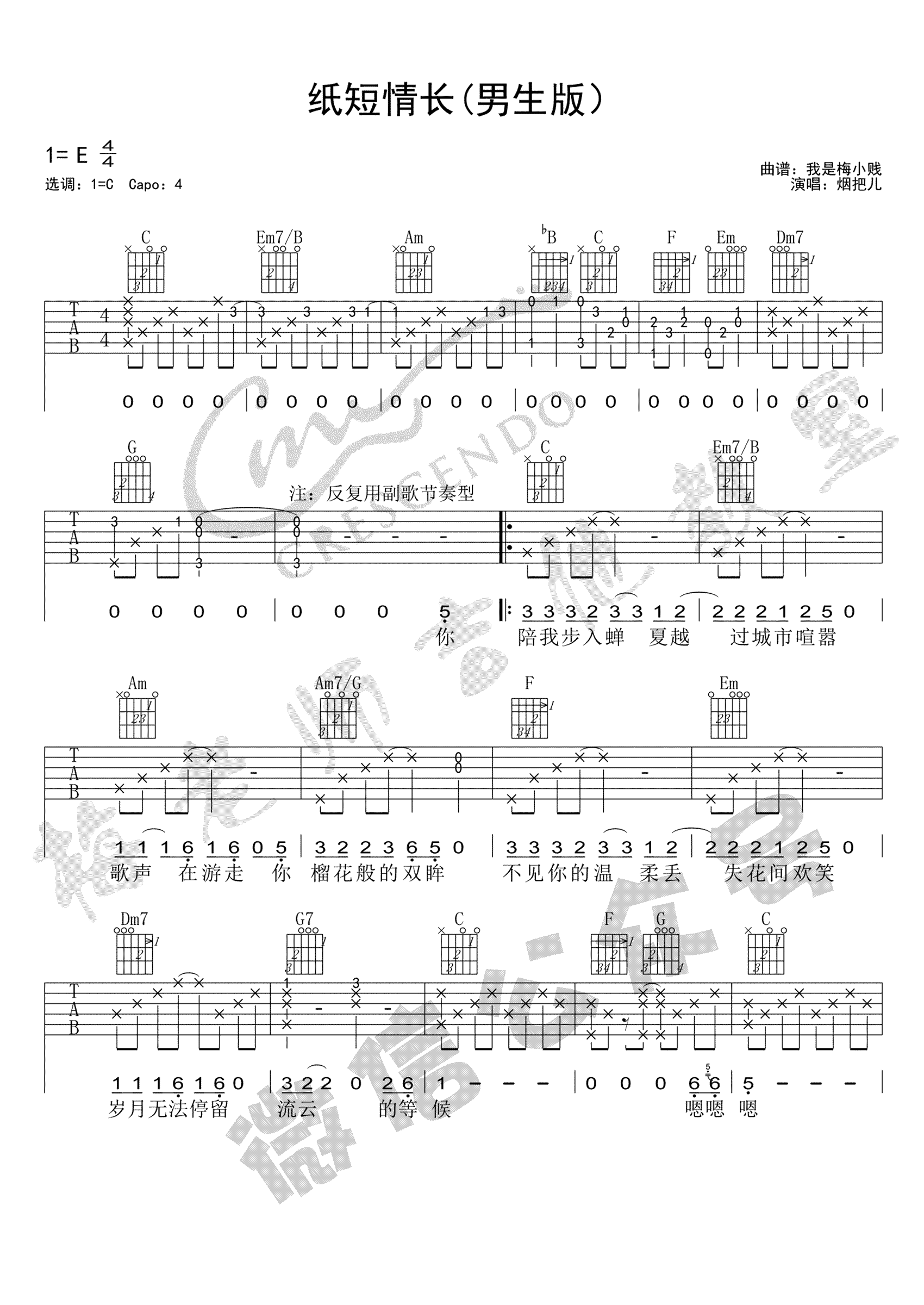 曲谱介绍: 纸短情长吉他谱,男生版弹唱谱,选调C,变调夹夹四品,烟把儿乐队火遍网络的一首民谣歌曲,纸短情长六线谱,吉他弹唱图片谱,感谢梅老师编配分享,91吉他谱网站上传。随谱附上曲谱配套的吉他弹唱演示视频,琴友们参照示范学习。微博、抖音、朋友圈里,全都是演绎这首歌的不同版本。