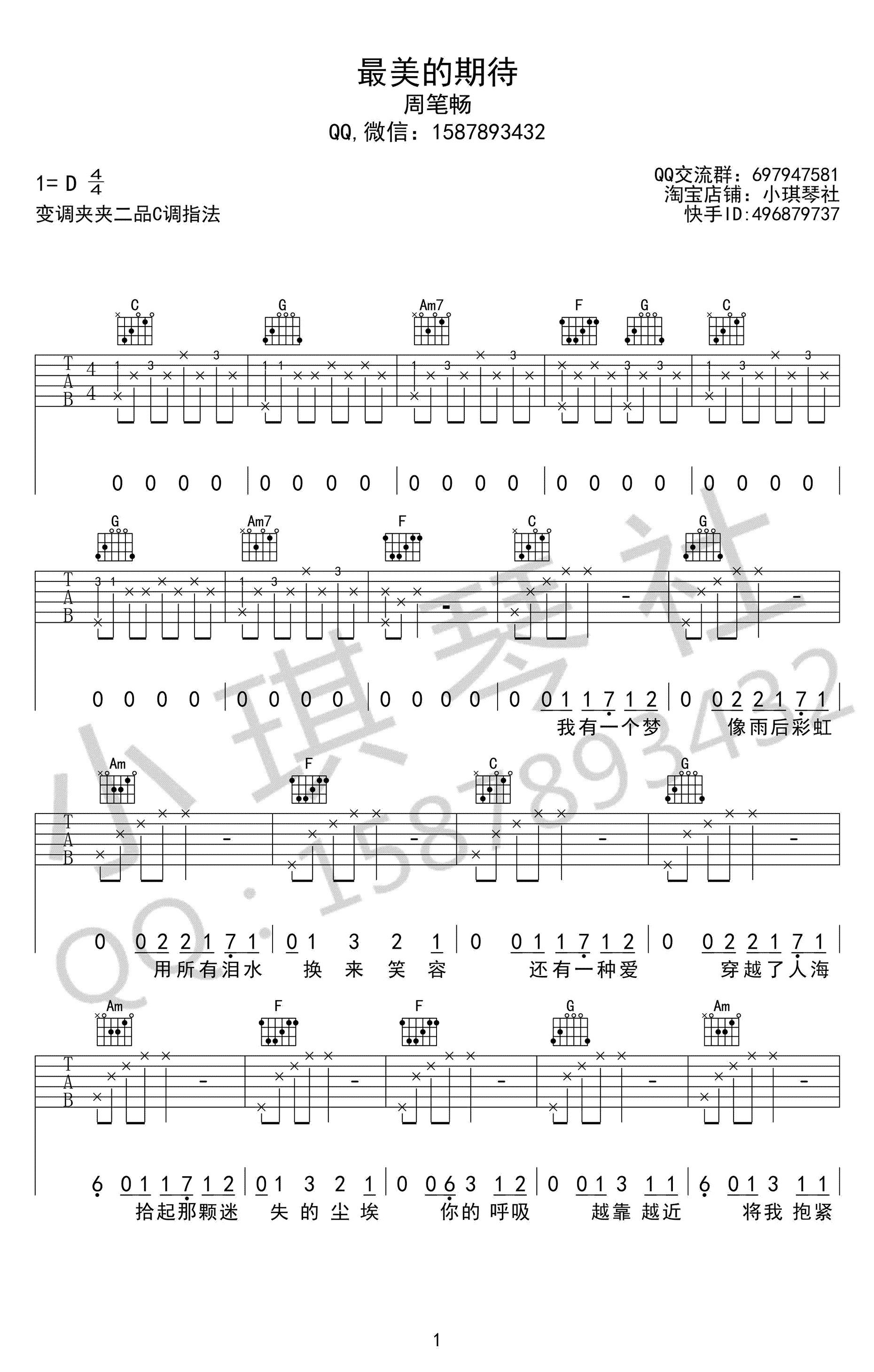 曲谱介绍: 最美的期待吉他谱,周笔畅演唱的一首热门网络歌曲,充满温暖励志的力量,最美的期待六线谱,高清弹唱图片谱,小琪琴社编配版本,91吉他谱网站整理上传。
