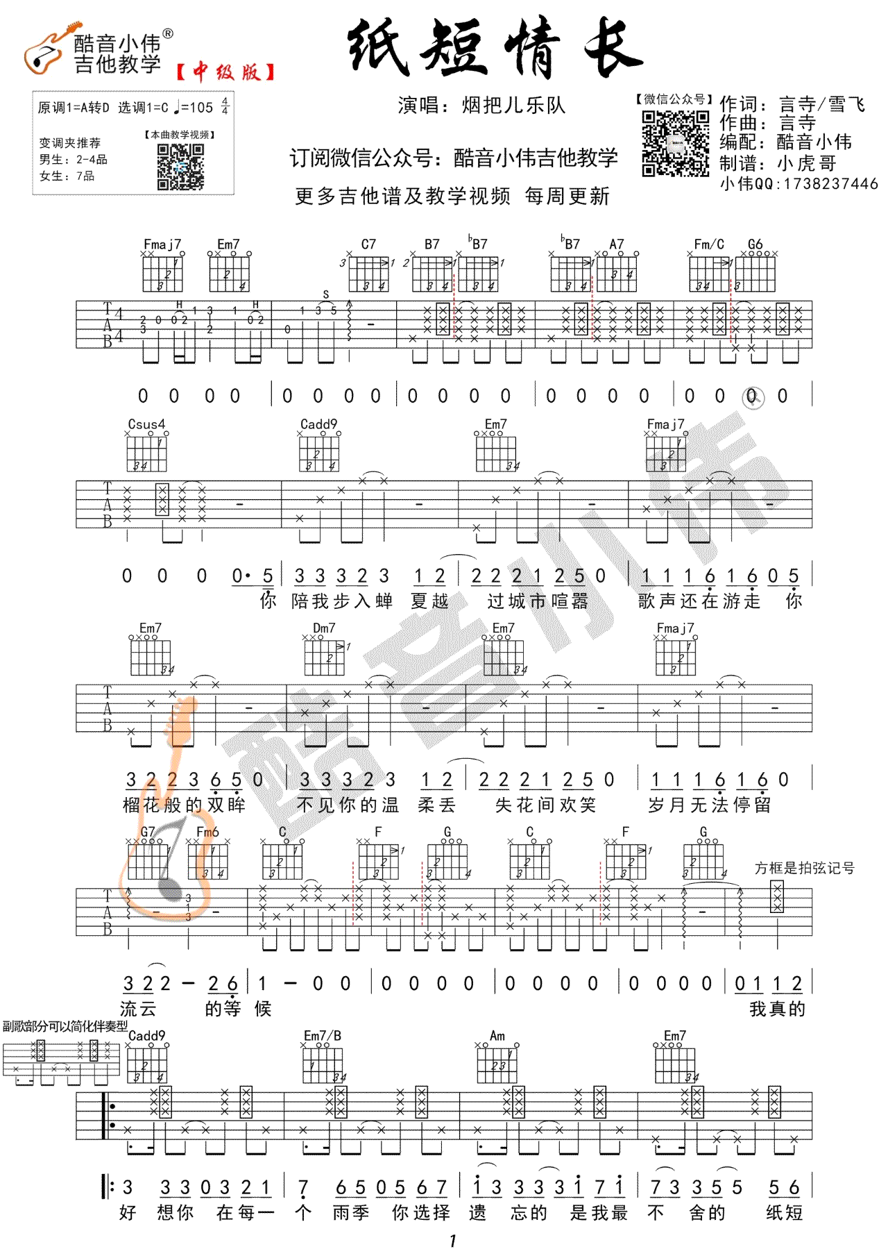曲谱介绍: 纸短情长吉他谱,烟把儿的一首热门歌曲,纸短情长六线谱,C调中级版,变调夹推荐,男生2-4品,女生七品。感谢酷音小伟出品,91吉他谱网站曲谱及教学视频同步上传分享。