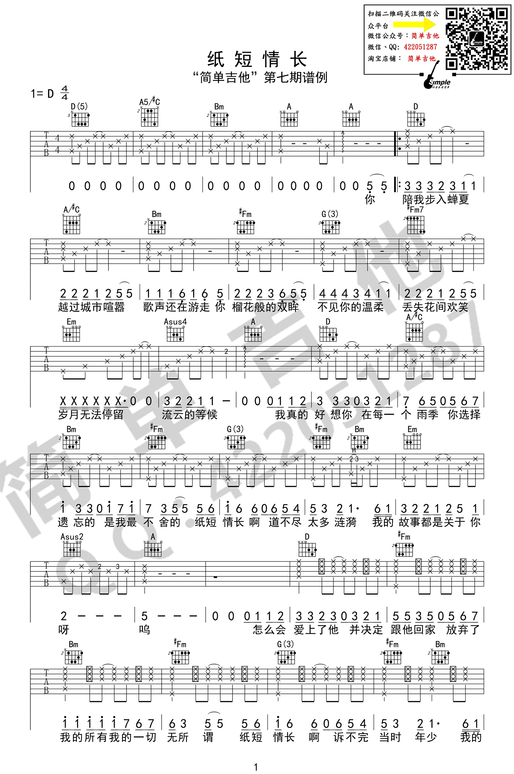 曲谱介绍: 纸短情长吉他谱,烟把儿乐队演唱,D调版本,完美弹唱谱,西安简单吉他编配出品,纸短情长六线谱,高清图片谱,91吉他谱网站上传。