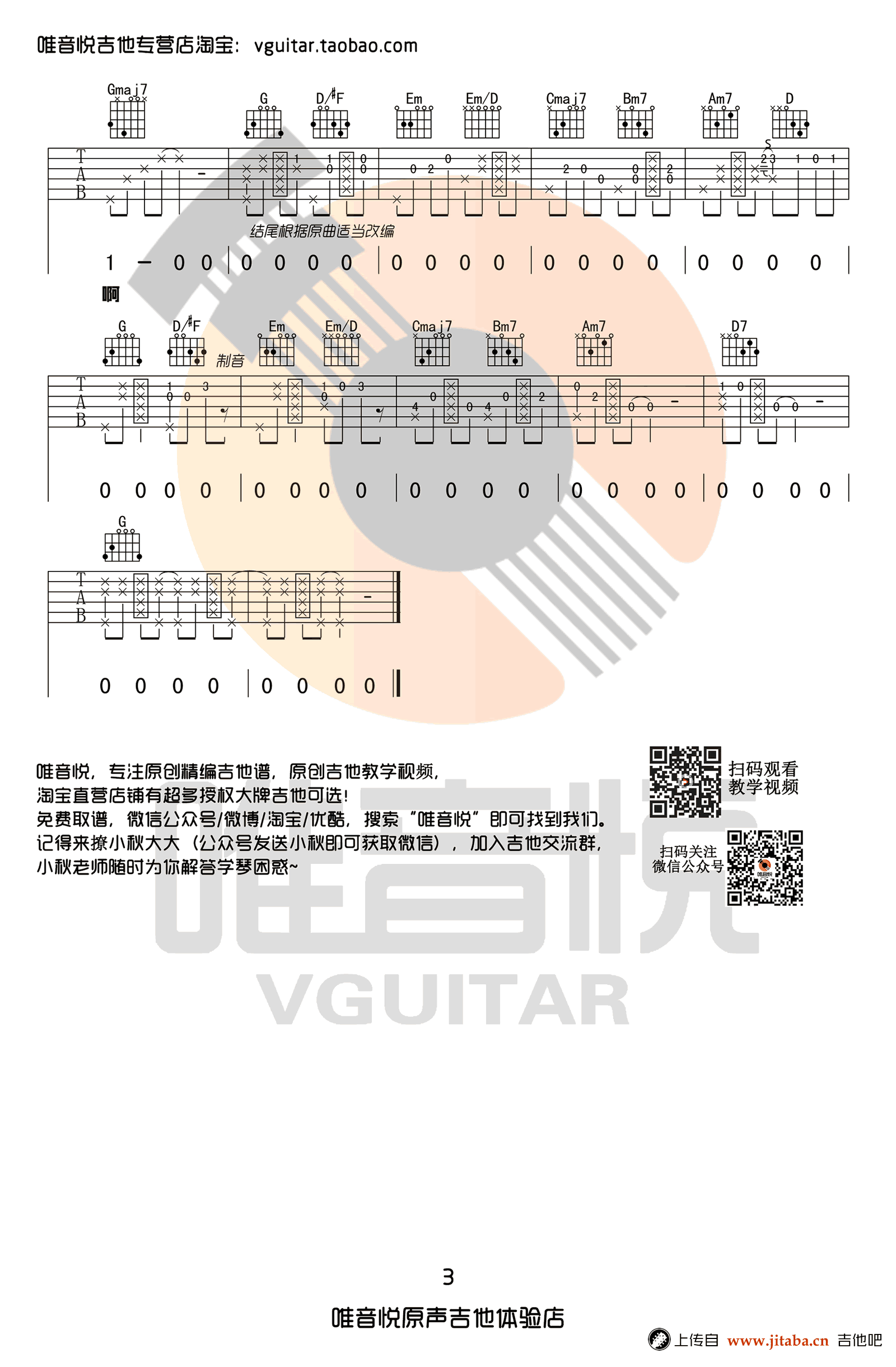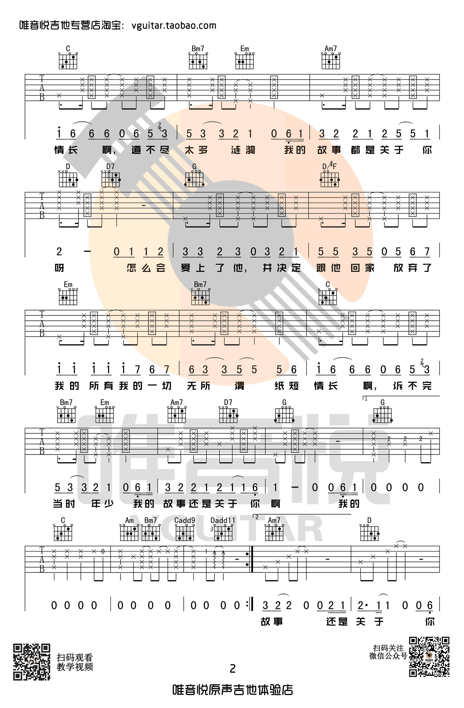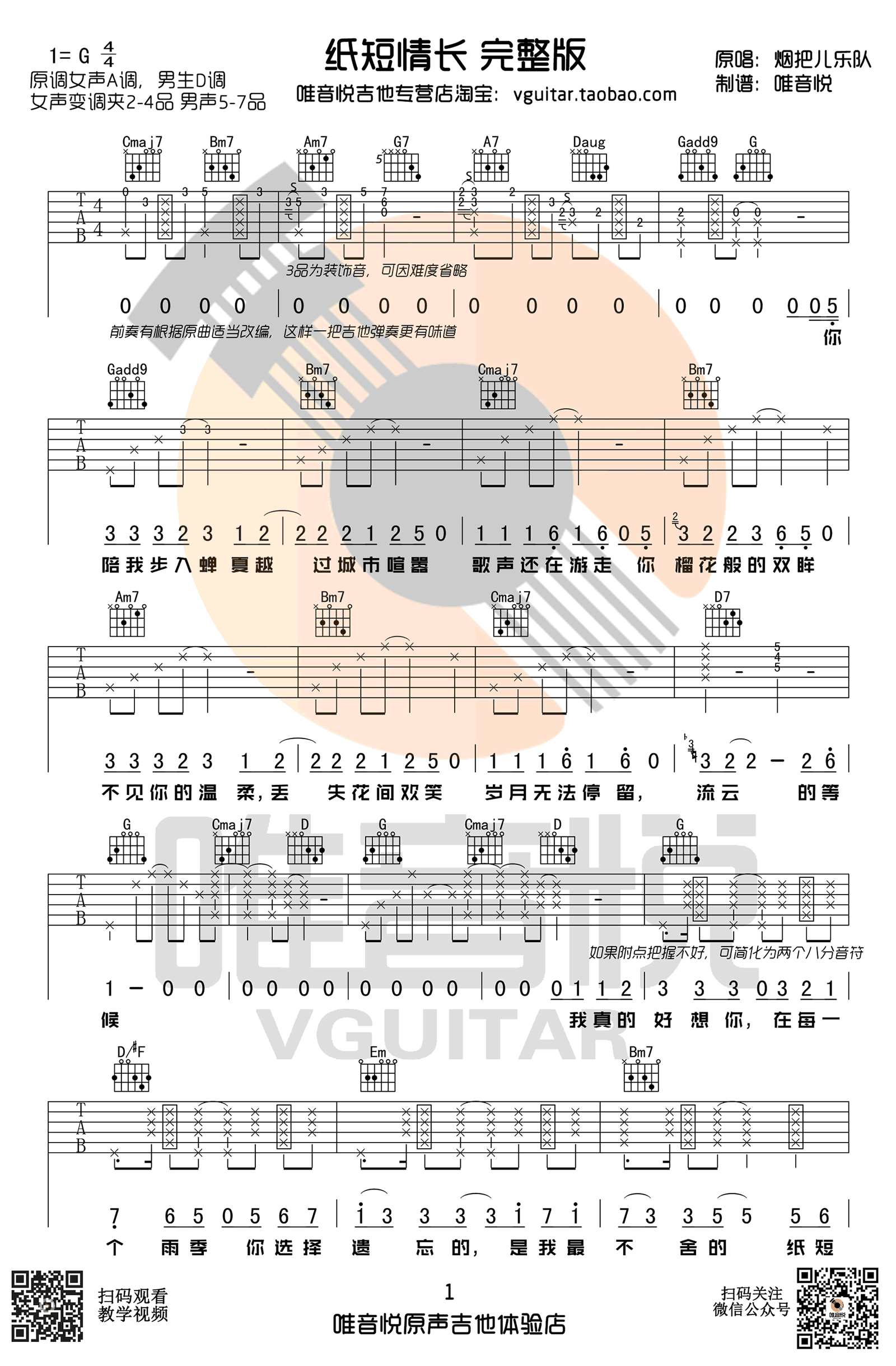 曲谱介绍: 纸短情长吉他谱,完整版编配,烟把儿乐队原创民谣作品,一首网络热门歌曲,纸短情长六线谱,G调指法,高清图片弹唱谱,感谢唯音悦出品,91吉他谱网站整理上传。 编配说明:这首歌前奏和尾奏都有经过些许的改编,因为前奏和尾奏有些不太适合编到一把吉他,如果直接只有和弦又太单调了,所以说稍微改编了一下。前奏和尾奏示范上是两个调性的,因为这首歌原曲也是由A转D的,这样单吉他很难唱,所以考虑到女生和男生弹唱的话,调性选取G调编配;因为男生唱D调或者C调其实还可以可以的,而变调夹在5-7品之间,女生A调其实弹唱有可能会低了点。大部分女生音域是偏高的,或许需要到2-4品之间,这样变调夹都不会夹的太高。如果用C调编配的话男生可以不夹,但是女生如果A调的话,就需要夹到9品了....况且A调还有可能低了点...