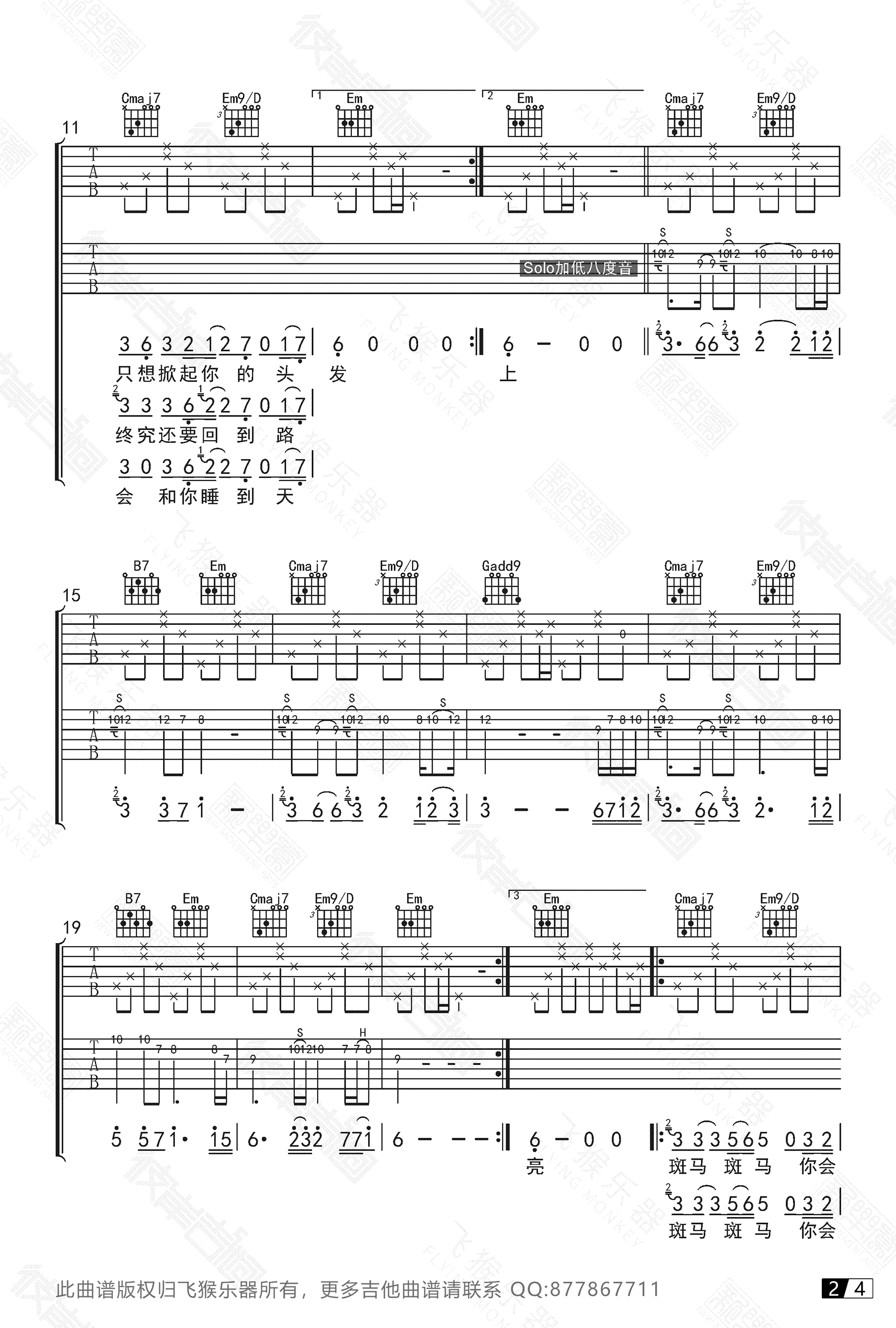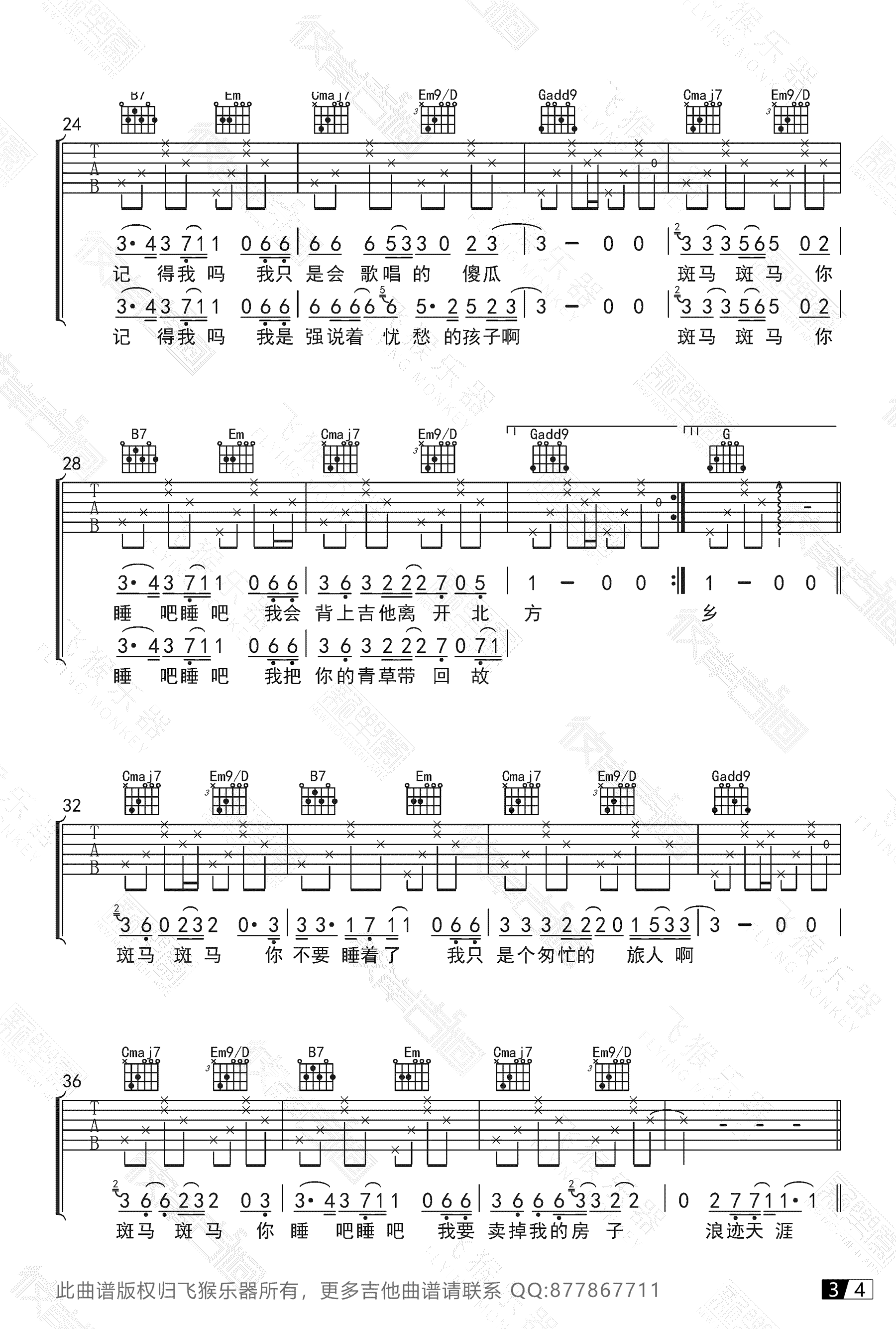 曲谱介绍: 斑马斑马吉他谱,宋冬野经典民谣歌曲,G调高清六线谱,完整版四张图片谱,斑马斑马吉他弹唱视频,飞猴乐器出品,91吉他谱网站上传推荐。学吉他,弹斑马。很多吉他初学者都练习的一首歌,幻想着“你睡吧睡吧…我只想掀起你的头发”……吉他弹唱《斑马,斑马》中间有solo哟。