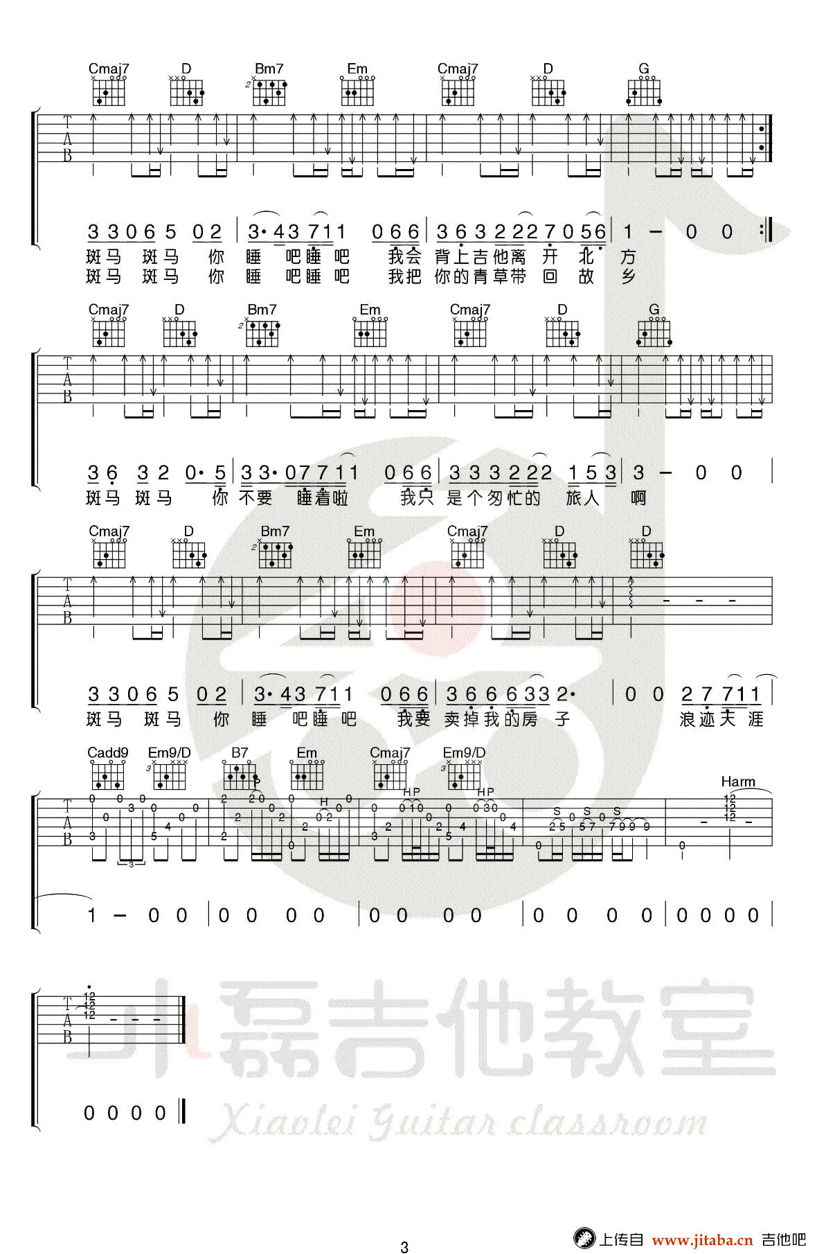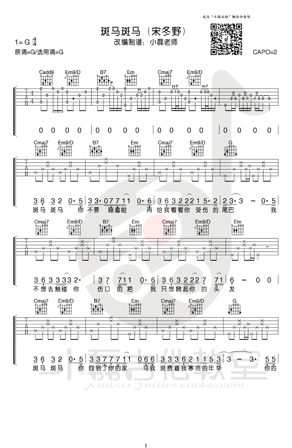 曲谱介绍: 斑马斑马吉他谱,宋冬野经典代表民谣歌曲,G调指法,变调夹夹二品。斑马斑马六线谱,高清弹唱图片谱,配套吉他教学视频,感谢小磊吉他编配出品,91吉他谱网站上传分享。 乐曲简析:这首《斑马,斑马》绝对算是民谣必备曲目了,最最可取的是原版大量的吉他演奏成分,大家可以练就熟练变成自己的拿手曲!小磊老师制作的这个乐谱的精髓在前奏和后段的扫弦,前奏部分可以说和原版一丝不差!后段的扫弦也可凸显歌曲的前后层次与气氛!难度:6级