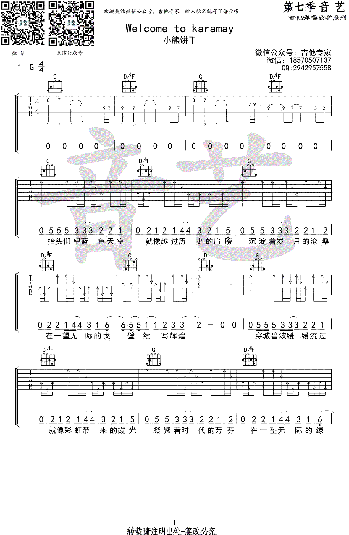 曲谱介绍: Welcome to karamay吉他谱,小熊饼干演唱,G调指法编配,高清弹唱图片谱,《Welcome to karamay》六线谱,感谢艺音出品,91吉他谱网站上传。 民谣歌手阿力普组建小熊饼干乐队并担任主唱,负责词曲创作,这首歌曲旋律轻快清新、歌词朴实无华,字里行间都流露着对克拉玛依浓浓的爱意。将家乡的新变化,以及自己对生活的认识、对家乡的情感融进了歌声里。