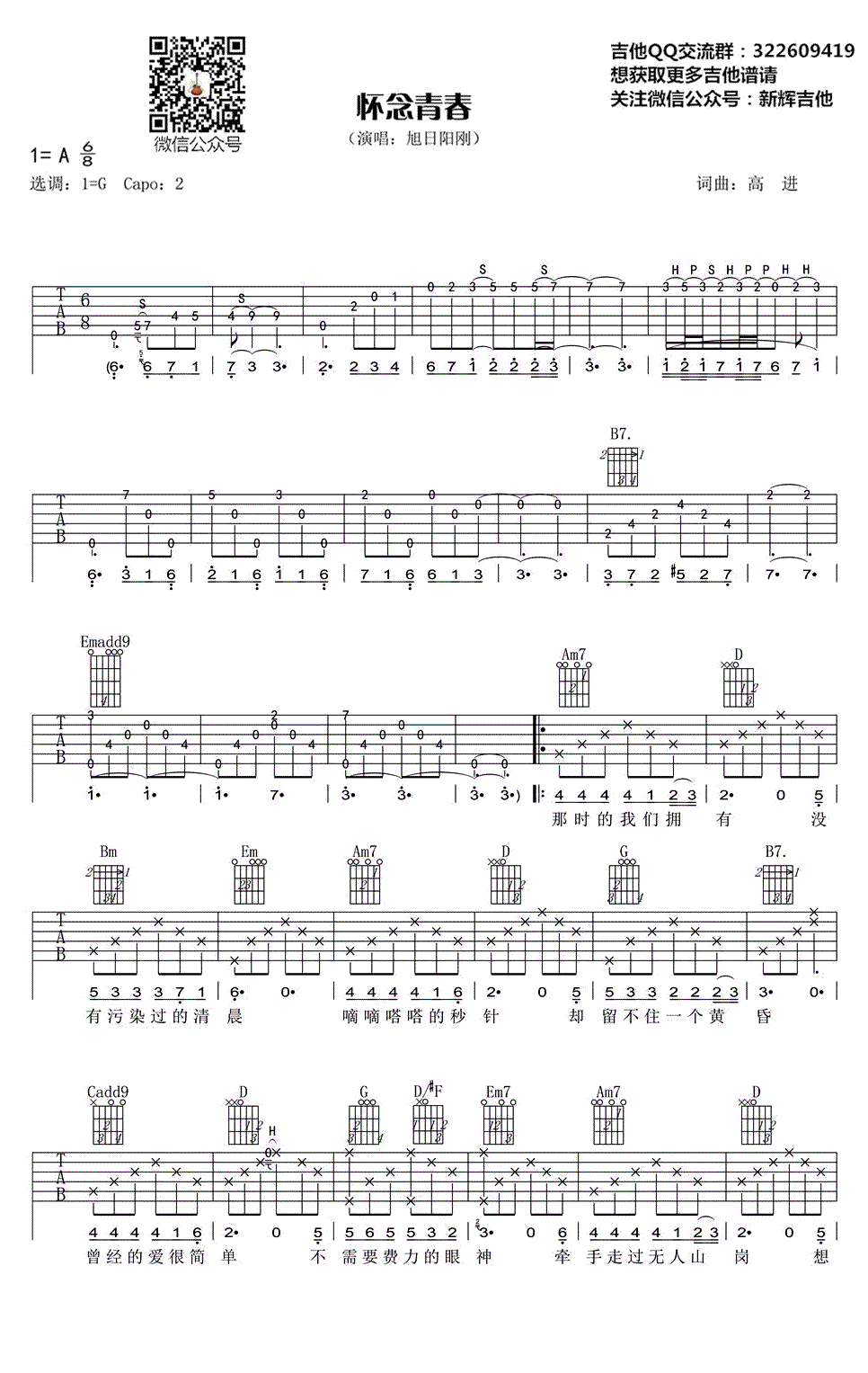 曲谱介绍: 旭日阳刚《怀念青春》吉他谱,G调弹唱谱,变调夹夹第二品,怀念青春六线谱,三张图片谱,新辉吉他出品,91吉他谱网站上传。 刘刚(旭日阳刚)的歌声朴实无华,感动了无数的听众,一首回首青春的歌曲中,感悟我们得到,我们失去和我们成长。回首看看走过的路程,那些理想和誓言都遗落在了青春的路上,脚印被尘埃掩盖、岁月沧桑…
