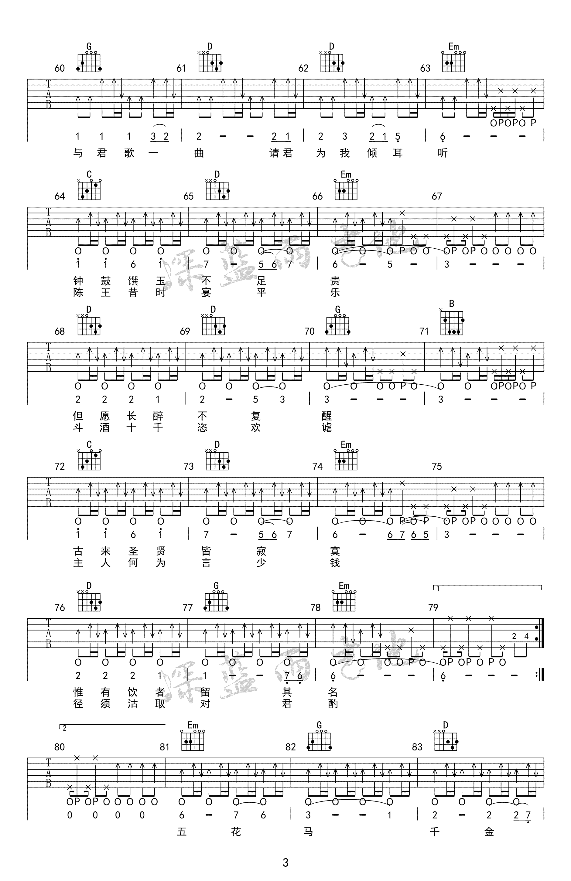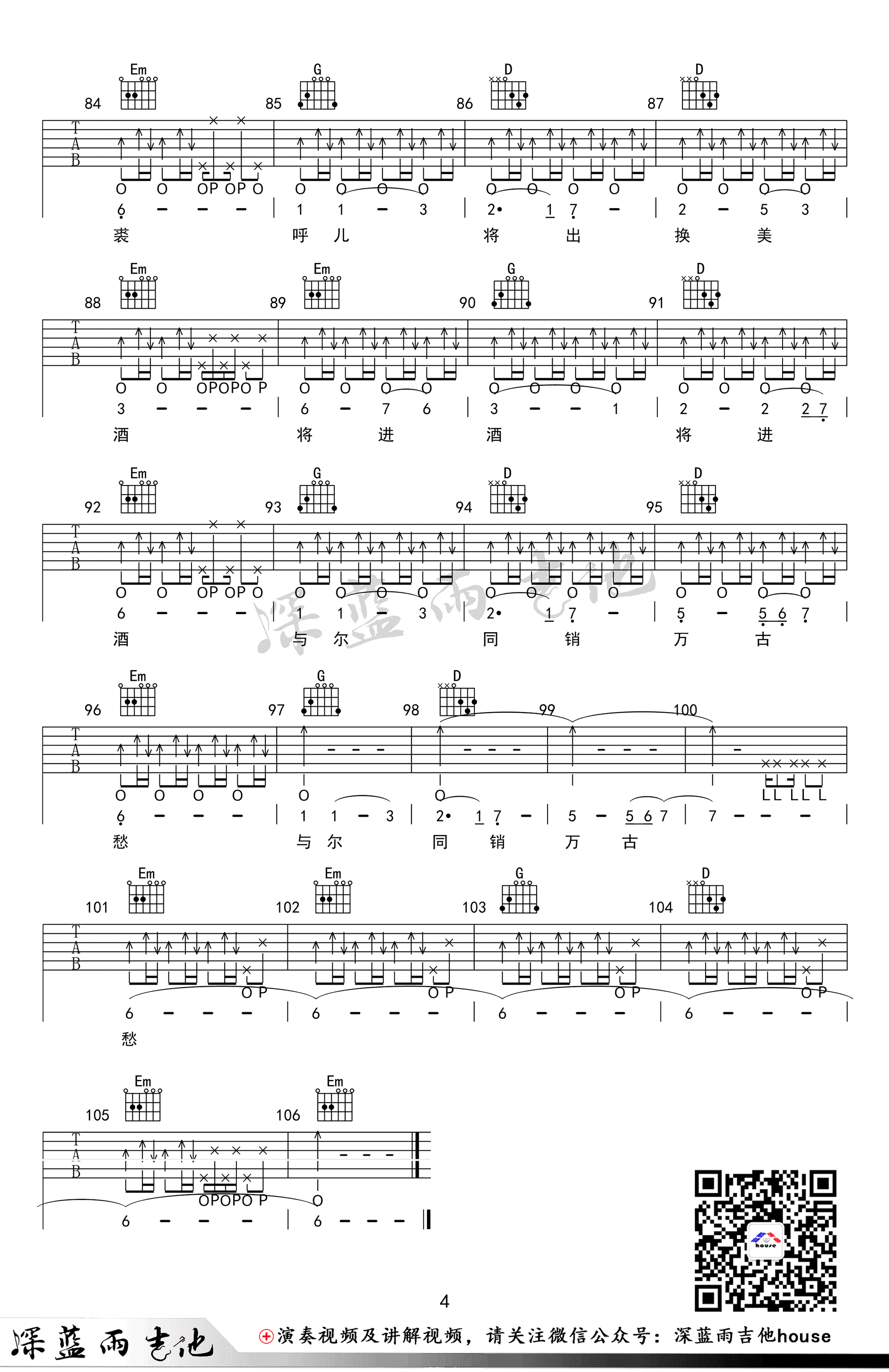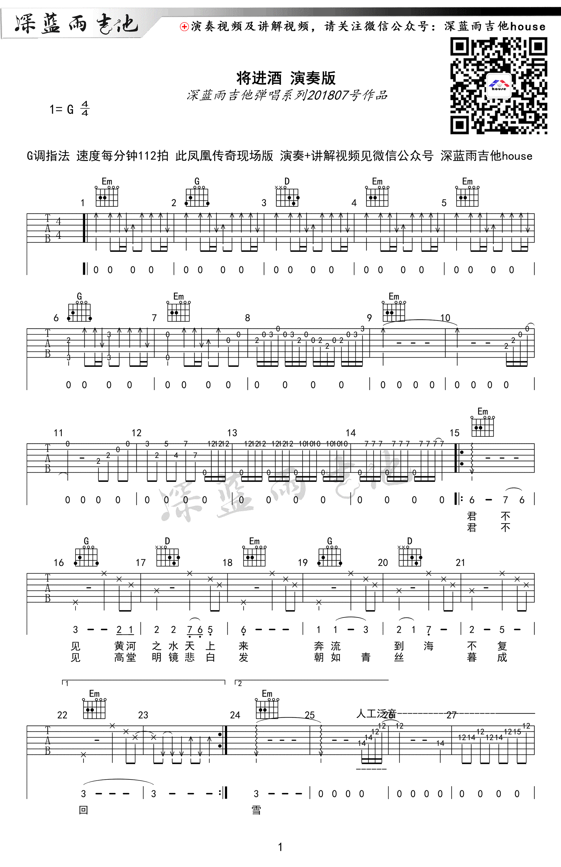 曲谱介绍: 陈涌海《将进酒》吉他谱,G调指法编配,曲谱为凤凰传奇现场版编配,苍凉高古的歌声,唱出激昂慷慨,任意侠气。将进酒六线谱,完整版共四张高清图片谱。感谢深蓝雨吉他出品,91吉他谱网站上传。随谱附上配套弹唱和教学视频,琴友们可以参照练习。对凤凰传奇演唱的这个版本练习有难度的同学,可以练习老师编配的陈涌海教授弹唱简单版。 将进酒吉他弹唱演示: