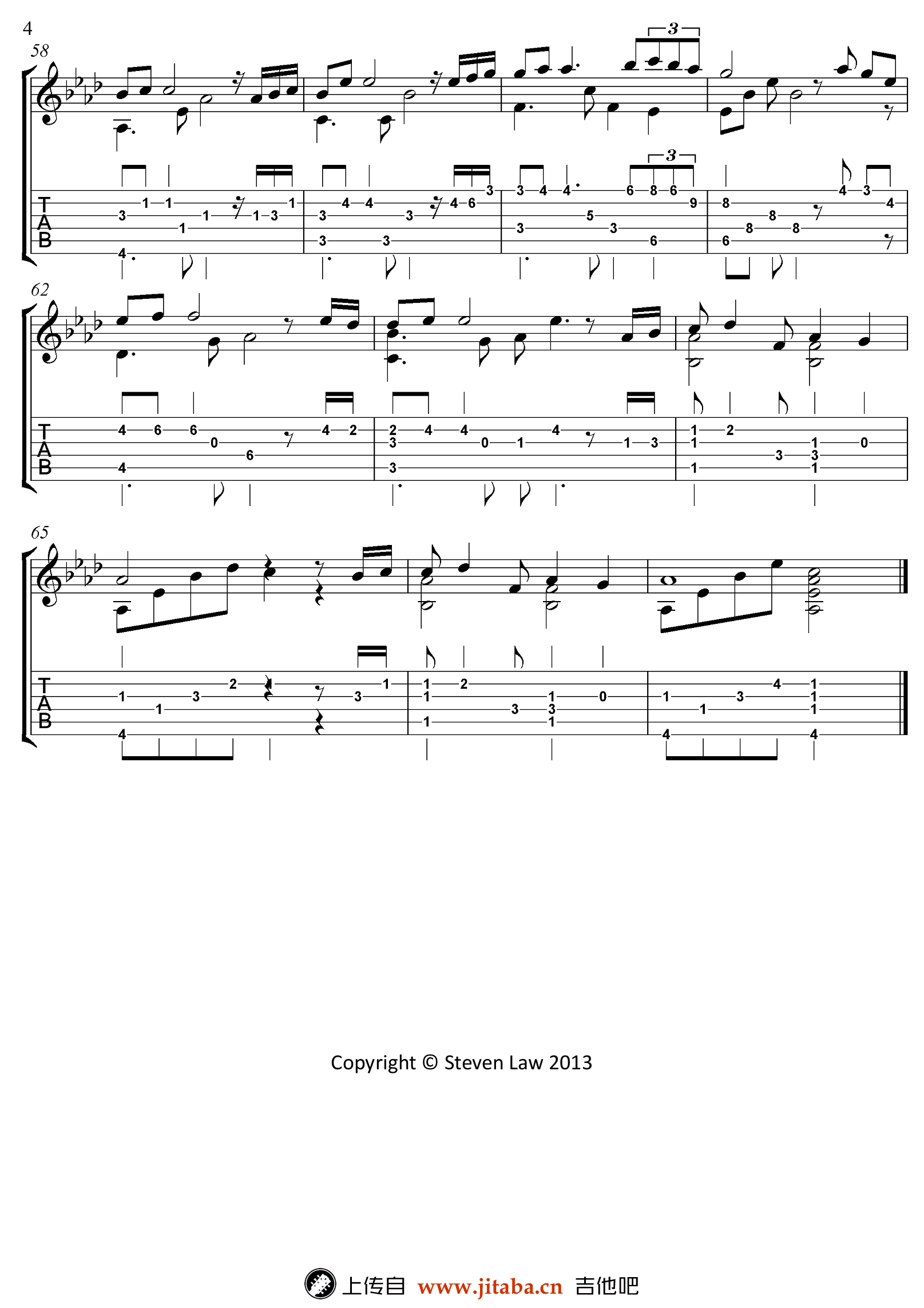 曲谱介绍: Kiss The Rain指弹谱,雨的印记吉他独奏谱, 韩国李闰珉创作的一首动听感人的雨的旋律,Kiss The Rain指弹吉他谱,高清图片谱。感谢罗翔编配出品,并为琴友们分享指弹演奏视频。 雨珠伴随音律孤独的奏响生命的厚重和时光的流连,心渐渐被浸染润透,没有激昂的高潮,只是安静温柔地诉说,那些走过的路,遇到的人,有过的心情和故事,曾经的快乐和忧伤,也像流水一样从心底流过、淡化、沉淀,最后只剩下潺潺的流水声。