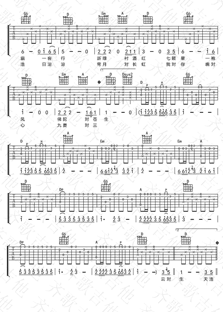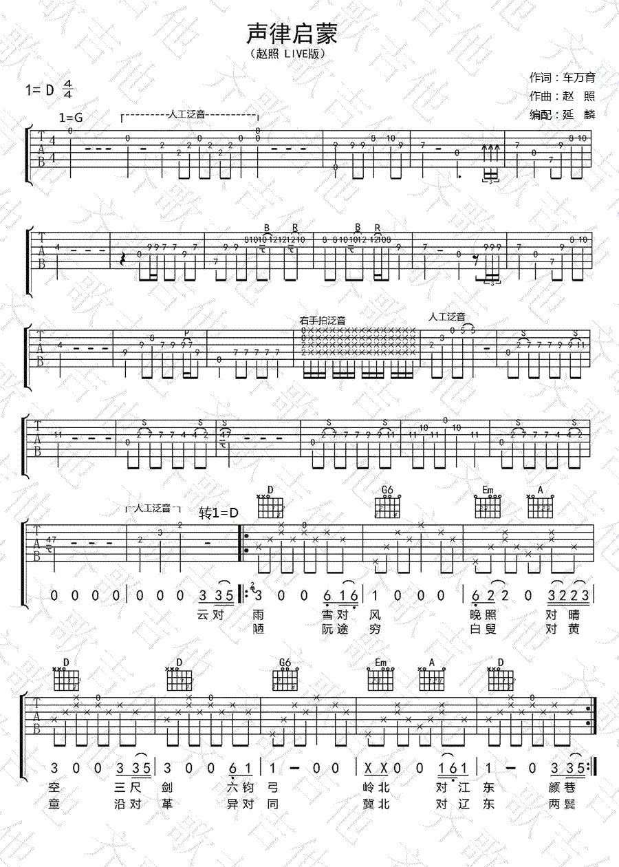 曲谱介绍: 声律启蒙吉他谱,赵照《经典咏流传》中演唱,《声律启蒙》吉他弹唱六线谱。词藻美丽,文化典故丰富,诗画一体,朗朗上口的句子,你背诵过吗?感谢齐歌吉他出品,91吉他谱上传图片谱。 编配说明:《声律启蒙》原是训练儿童应对,掌握声韵格律的启蒙读物。赵照在这里把它谱上了曲子,成为一首歌。 这首歌有两个版本,这里是编配的5.33分的版本,前面原曲是琵琶演奏的一段《春江花月夜》的改编。在这里移植到吉他上,基本上保持了味道,也做了一些取舍。 人工泛音,在谱子上标注的是左手按弦的位置,右手在这个数字上加12,即为泛音点。比如,谱子上是0,那么实际弹的时候,要用右手食指触12品泛音点,然后再用拇指或无名指拨响该弦即可。  弹奏的时候,节奏型可以加上自己自由发挥,两遍不可能一样的。