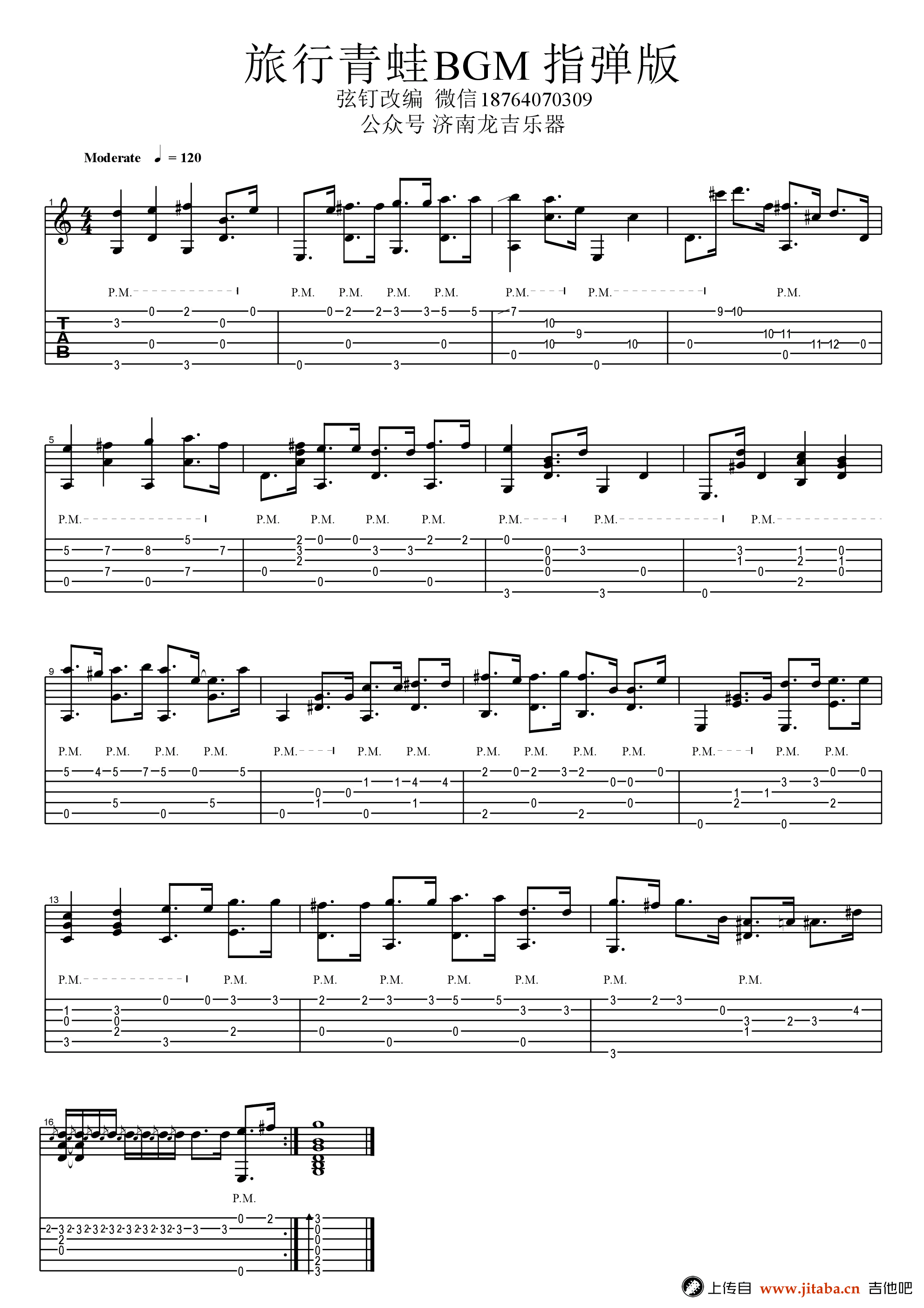 曲谱介绍: 旅行青蛙指弹吉他谱,休闲小游戏《旅行青蛙》BGM吉他独奏谱,高清图片谱,受到广大佛系青年的喜爱的养生手游刷屏了朋友圈。感谢弦钉编配,91吉他谱整理上传。为了使用吉他还原原曲跳跃欢快的曲风,本曲谱使用boom chick来进行编曲,原曲为G调,相对指法不难,建议大家右手拇指佩戴指套进行演奏,附上配套吉他演奏视频示范方便大家参考练习。
