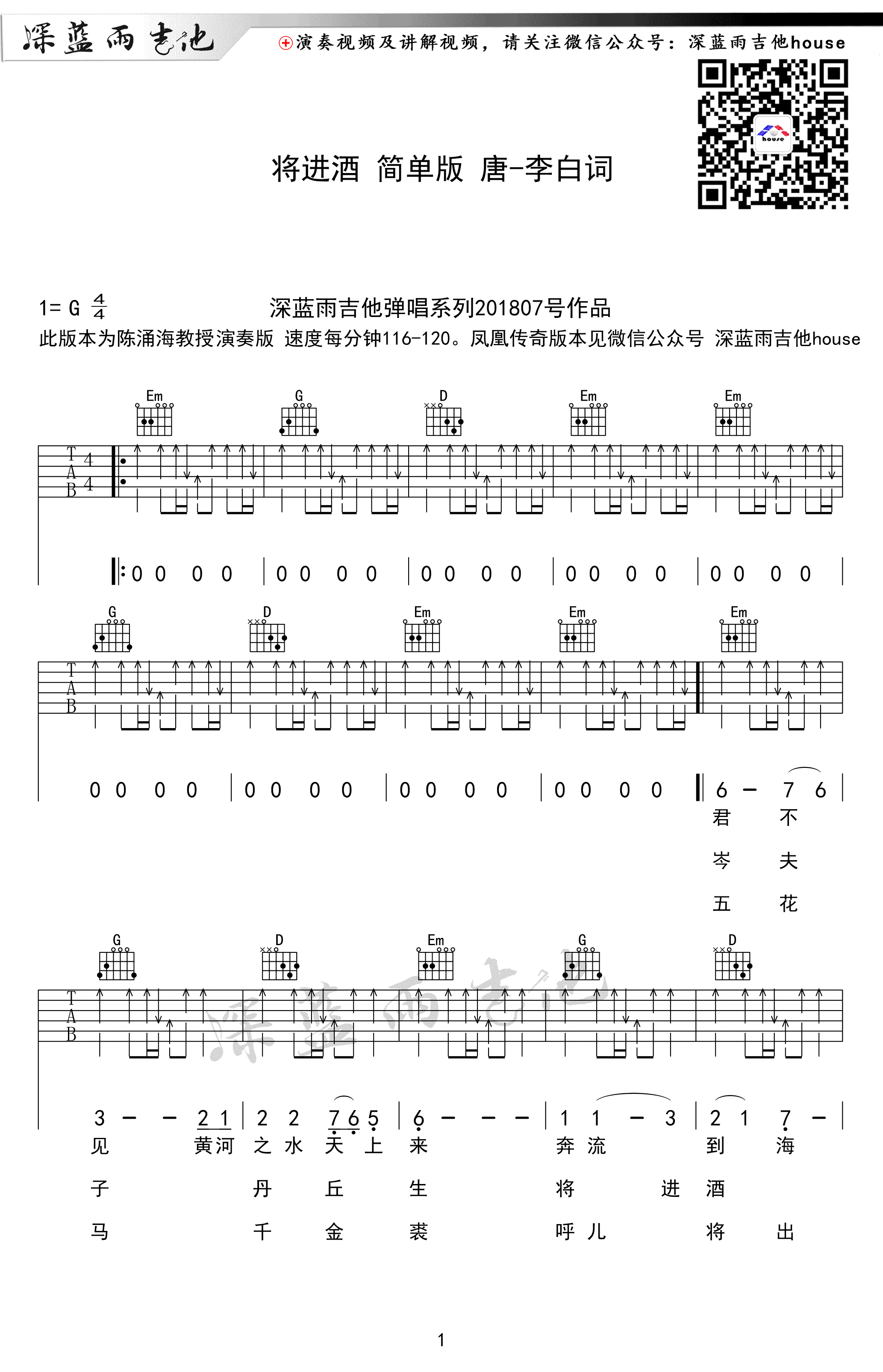 曲谱介绍: 将进酒吉他谱,陈涌海教授演奏版本改编,G调简单版,将进酒六线谱,高清图片谱,感谢深蓝雨吉他编配出品,91吉他谱上传推荐。 一曲苍凉澎湃、恣意潇洒的高歌,唱出诗仙的豪放情怀,手上的琴弦击打灵魂,内心的豪放与古歌遽然契合,带我们仿佛穿越千年,重回梦中的李白大唐 。