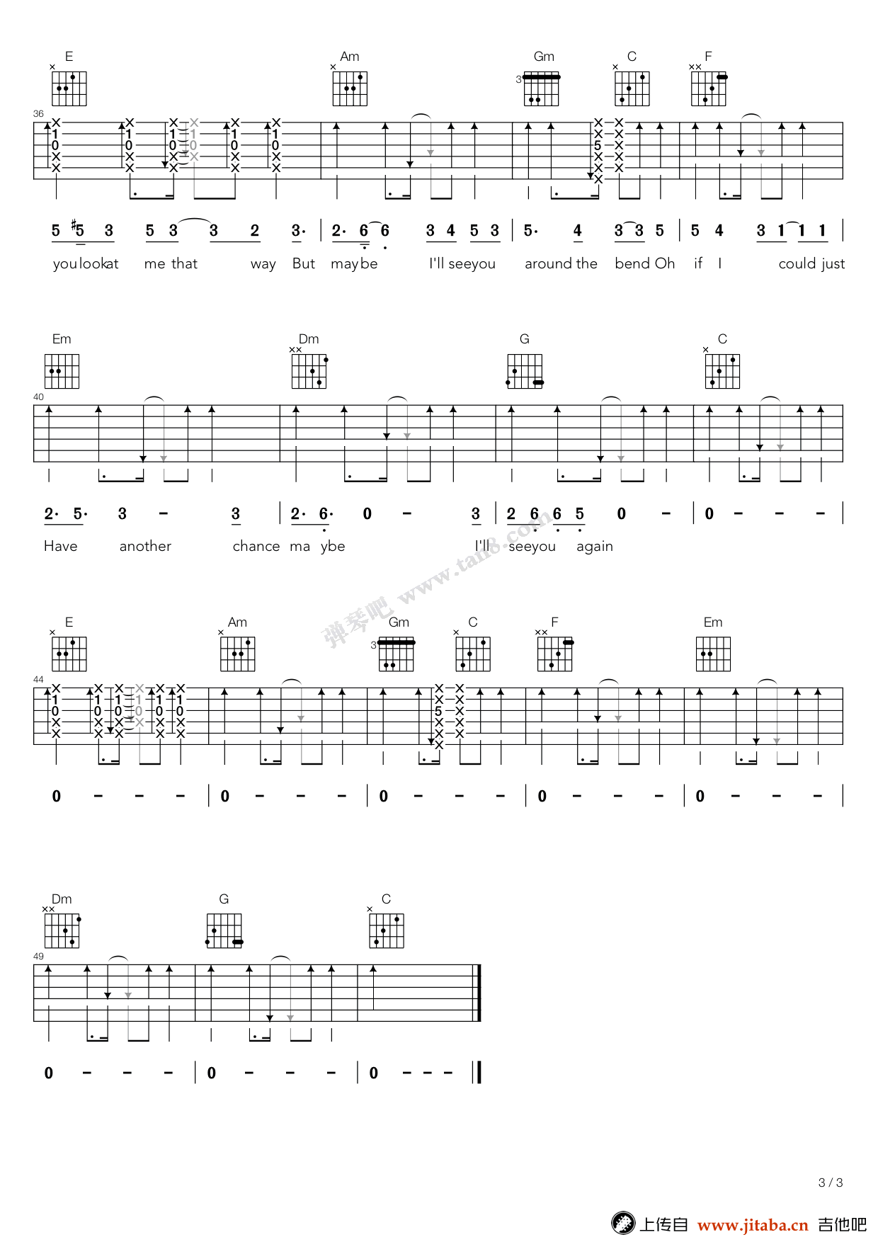 曲谱介绍: 窦靖童《See You Again》吉他谱,动画电影《声之形》推广曲,窦靖童创作演唱,See you again吉他弹唱谱,C调指法编配,三张图片谱。感谢弹琴吧出品,91吉他谱网站上传。 歌声淡淡的诉说青春懵懂的岁月,那些感伤和回忆,那些挣扎与成长。低吟浅唱中触动我们内心最柔软的部分。