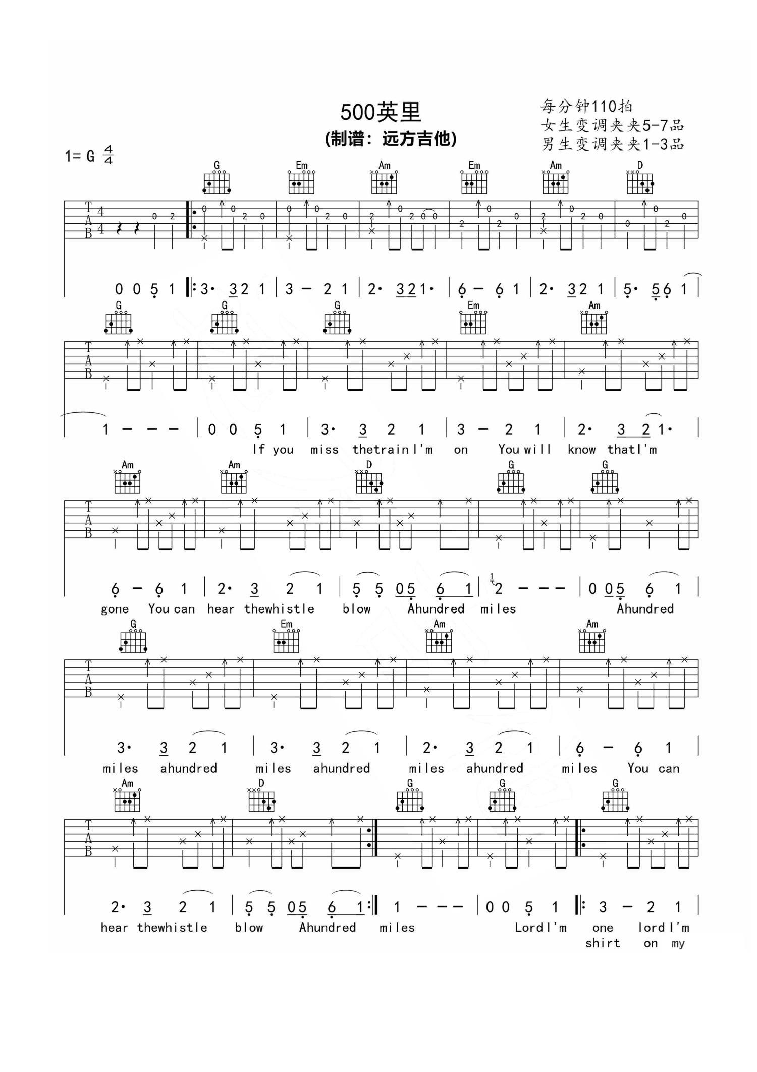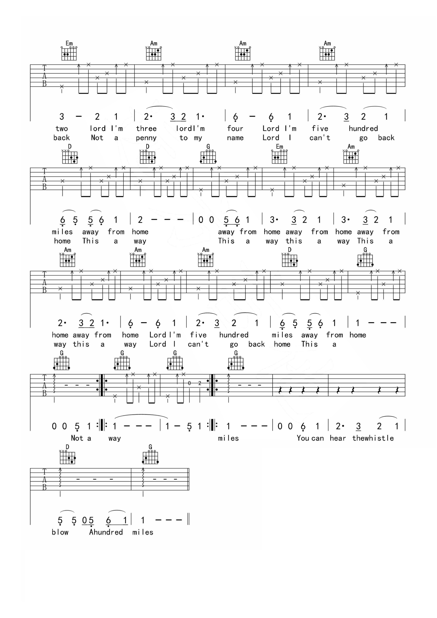 曲谱介绍: 一首经典英文民谣歌曲,改编为G调指法 一首非常好听的经典英文歌曲,醉乡民谣《离家五百里》
