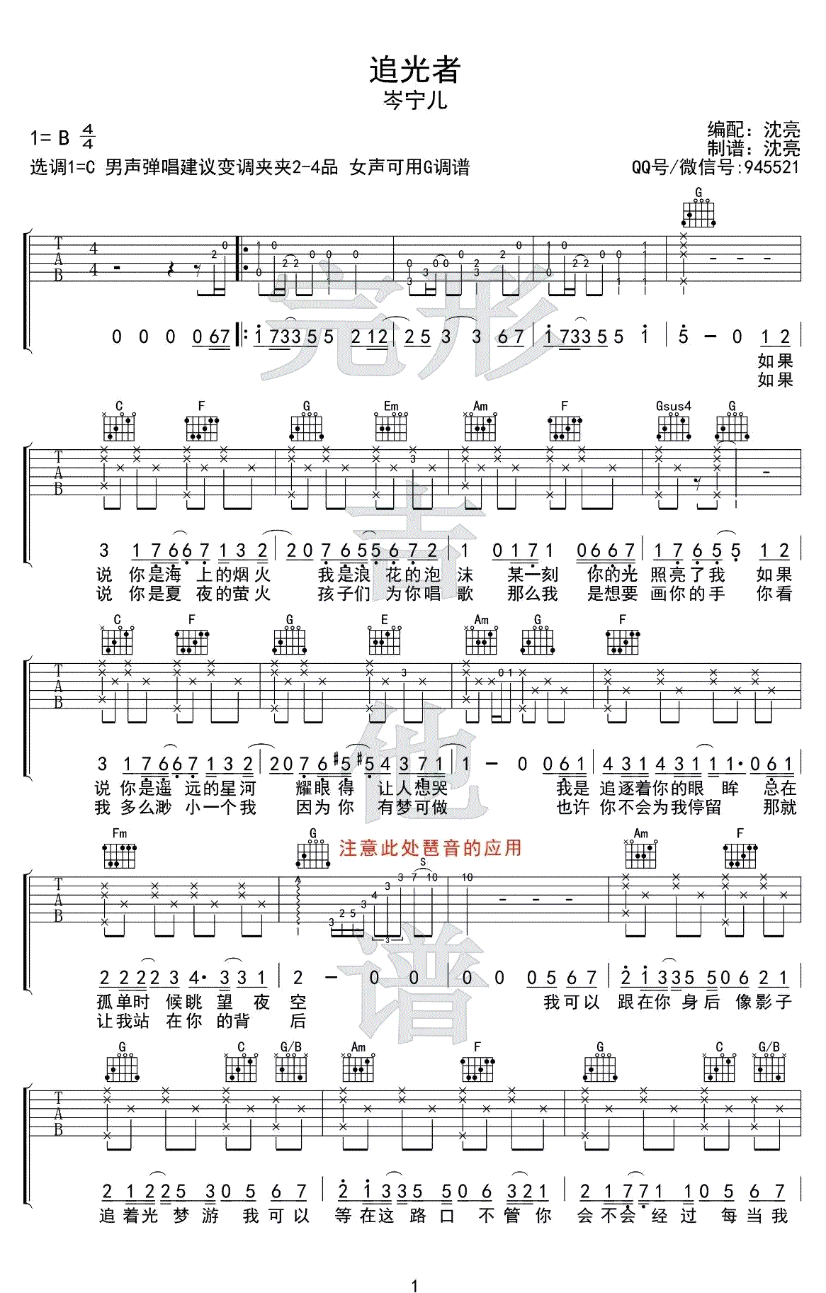 曲谱介绍: 岑宁儿《追光者》吉他谱,电视剧《夏至未至》主题曲,一首词曲俱佳的热门歌曲。追光者吉他六线谱,高清图片谱,本曲谱为C调男生和G调女生两个版本编配,大家根据自己的音域调节变调夹即可。这个曲谱重点学习运用琶音穿插在伴奏中。随谱附上感谢沈亮老师编配分享,随谱附上吉他弹唱示范,琴友们参照演示视频练习吧。